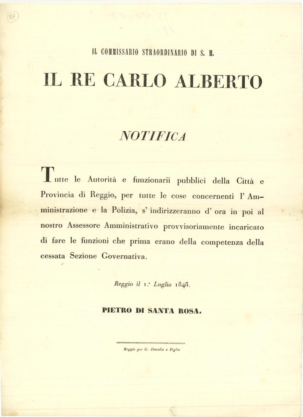 Documento, antico ed originale proveniente da importante collezione reggiana, in cui viene pubblicato “Tutte le Autorità e funzionarii pubblici della Città e Provincia di Reggio, per tutte le cose concernenti l’Amministrazione e la Polizia, s’indirizzeranno d’ora in poi al nostro Assessore Amministrativo provvisoriamente incaricato di fare le funzioni che prima erano della competenza della cessata Sezione Governativa”. Reggio il 1 Luglio 1848. Pietro di Santa Rosa – Reggio per G. Davolio e Figlio
