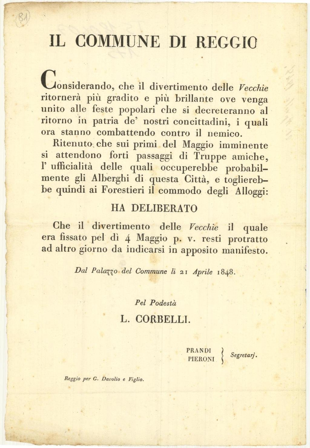 Documento, antico ed originale proveniente da importante collezione reggiana, in cui viene pubblicato “Il Commune di Reggio, Considerando, che il divertimento delle Vecchie ritornerà più gradito e più brillante…ritenuto che sui primi di Maggio imminente si attendono forti passaggi di Truppe amiche: ha deliberato Che il divertimento delle Vecchie il quale era fissato pel dì 4 Maggio p.v. resti protratto ad altro giorno da indicarsi in apposito manifesto.” Da Palazzo del Commune li 21 Aprile 1848. Pel Podestà L. Corbelli. Prandi, Peroni Segretari – Reggio per G. Davolio e Figlio