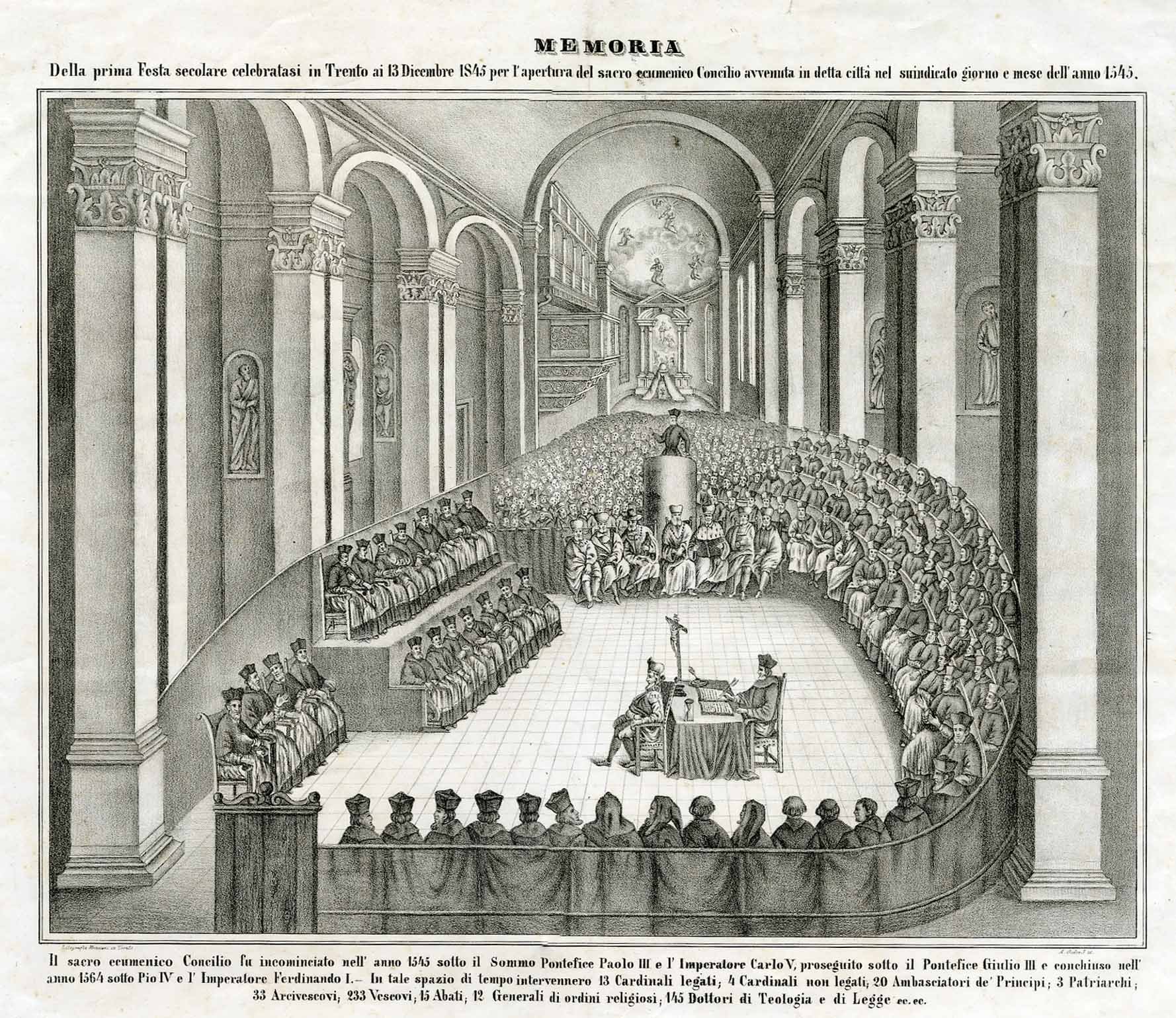 Litografia di dimensioni 335x435 mm. Condizioni : USATO - Stato : Buono, ordinari segni d'uso e del tempo. Lievissimi segni di foxing. Altre note : Incisione raffigurante una seduta del sacro Concilio di Trento. Nella parte superiore leggiamo: "MEMORIA della prima Festa secolare celebratasi in Trento ai 13 dicembre 1845 per l'apertura del sacro ecumenico Concilio avvenuta in detta città nel suindicato giorno e mese dell'anno 1545". Nella parte inferiore: "Il sacro ecumenico Concilio fu incominciato nell'anno 1545 sotto il Sommo Pontefice Paolo III e l'imperatore Carlo V, proseguito sotto il Pontefice Giulio III e conchiuso nell'anno 1564 sotto Pio IV e l'imperatore Ferdinando I. In tale spazio di tempo intervennero 13 Cardinali legati; 4 Cardinali non legati; 20 Ambasciatori de' Principi; 3 Patriarchi; 33 Arcivescovi; 233 Vescovi; 15 Abati; 12 Generali di ordini religiosi; 145 Dottori di Teologia e di Legge ec. ec.".