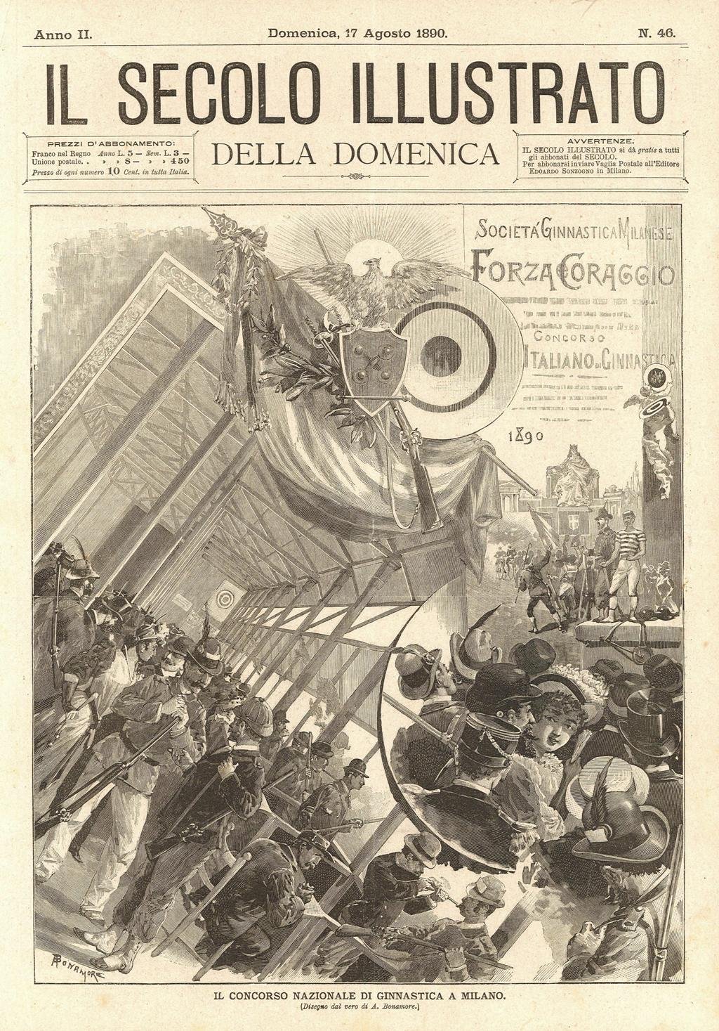 Stampa, antica ed originale, con raffigurazione della cerimonia inaugurale del concorso nazionale, organizzato dalla società Forza e Coraggio. Testo al verso. Autore: Bonamore A. dis. Luogo: Milano. Anno: 1890. Tecnica: xilografia. Dimensioni: 300x249.