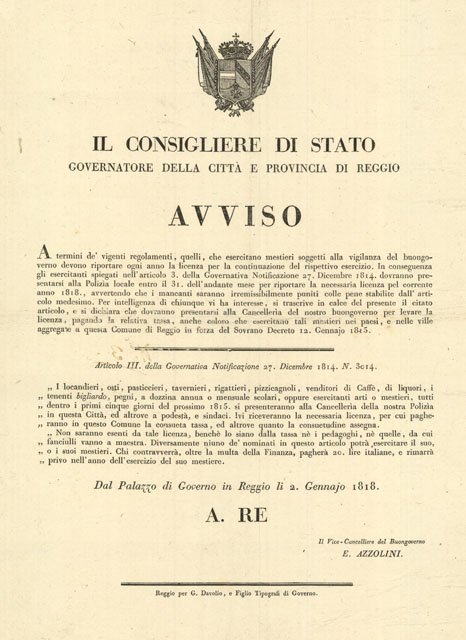 Tassa per rinnovo licenza per “Il locandieri, osti, pasticceri, tavernieri, rigattieri, pizzicagnoli, venditori di Caffè, di liquori ecc”. Dal Palazzo di Governo in Reggio li 2 Gennajo 1818 . A. RE – Il vice – Cancelliere del Buongoverno E. Azzolini – Reggio per g. Davolio, e Figlio Tipografi di Gove