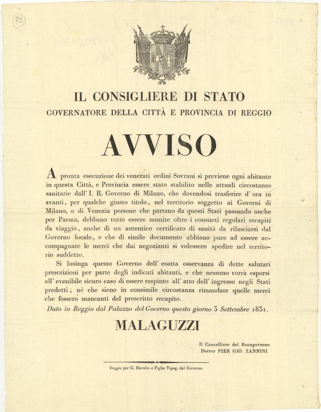 Documento, antico ed originale proveniente da importante collezione reggiana, in cui viene scritto “A pronta esecuzione dei venerati ordini Sovrani si previene ogni abitante in questa Città, e Provincia essere stato stabilito nelle attuali circostanze sanitarie dall’I. R. Governo di Milano, che dovendosi trasferire…nel territorio soggetto ai Governi di Milano, e di Venezia persone che pertanto da questi Stati passando anche per Parma, debbano tutte essere munite oltre i consueti regolari recapiti di viaggio…” Dato in Reggio dal Palazzo del Governo questo giorno 3 Settembre 1831. Malaguzzi. Il Cancelliere del Buongoverno Dottor Pier Gio. Zannini - Reggio per G. Davolio e Figlio Tipog. del Governo