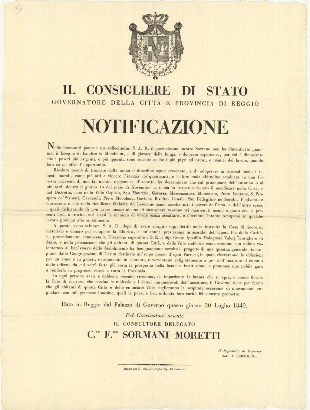 Il Consigliere di Stato Governatore della Città e provincia di Reggio – Notificazione