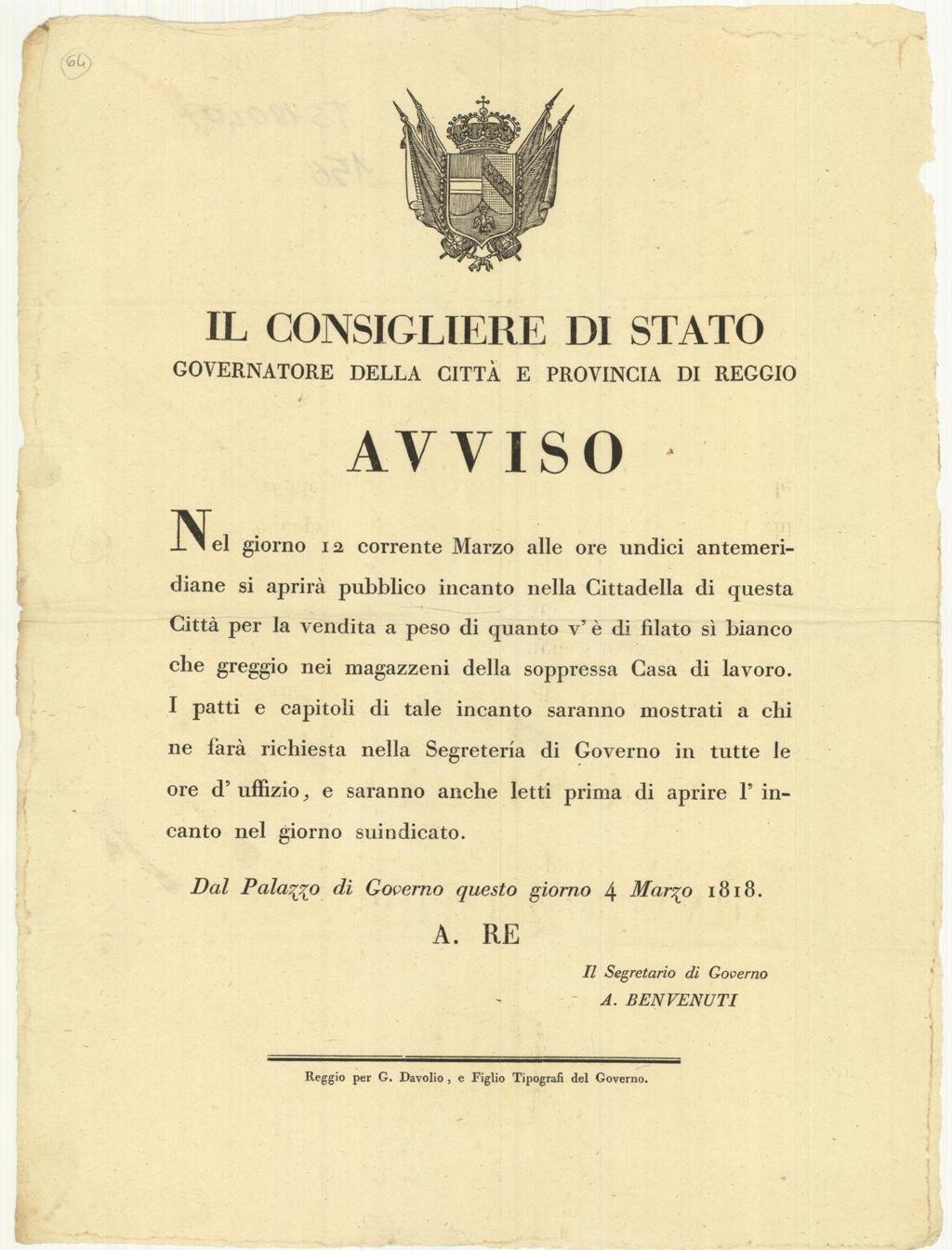 Documento, antico ed originale proveniente da importante collezione reggiana, dell'avviso “Nel giorno 12 corrente Marzo alle ore undici antemeridiane si aprirà pubblico incanto nella Cittadella di questa città per la vendita a peso di quanto v’è di filato sì bianco che greggio nei magazzeni della soppressa Casa di lavoro”. Dal Palazzo di Governo questo giorno 4 Marzo 1818 A. Re - Il segretario di Governo A. Benvenuti - Reggio per G. Davolio, e Figlio Tipografi del Governo