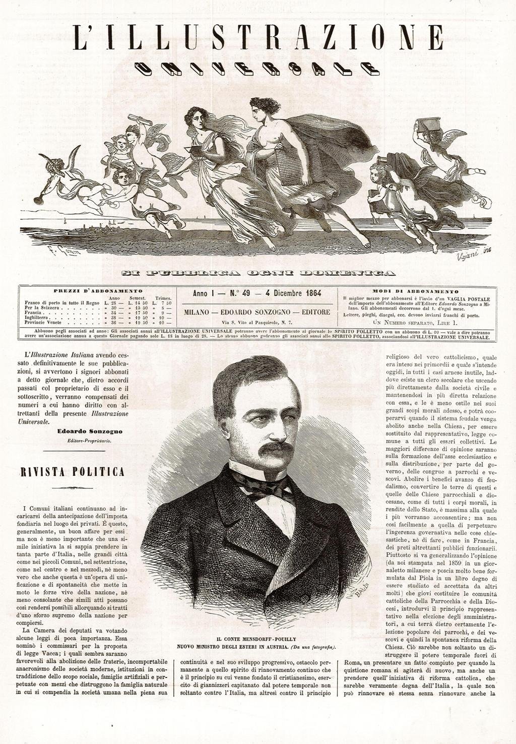 Stampa, antica ed originale, raffigurante il Conte Mensdorff Pouilly. Inserita in una rara pubblicazione, edita dall'Editore Edoardo Sonzogno, spesso non inserita nelle bibliografie di riferimento. Testo al retro
