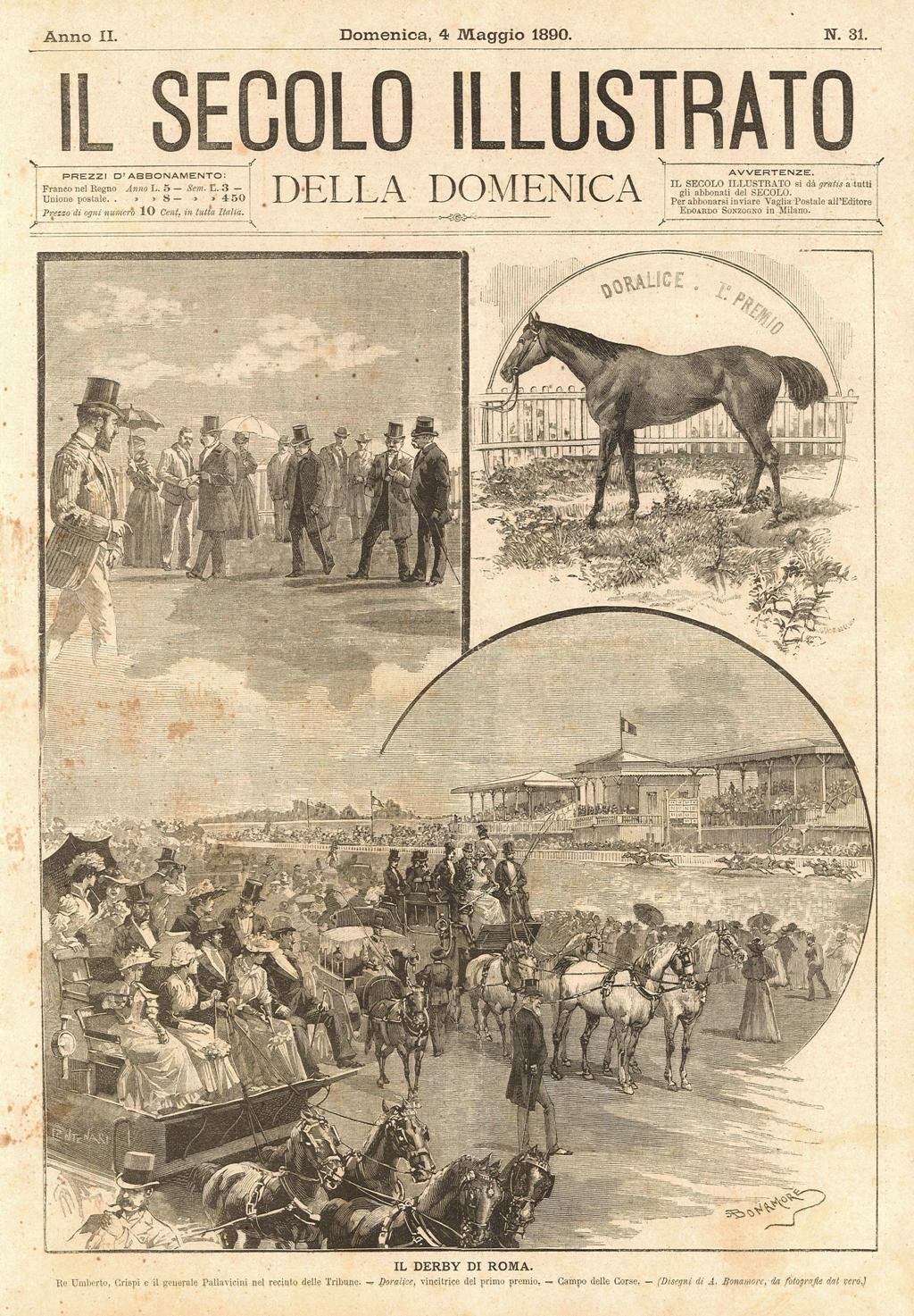 Stampa, antica ed originale, con raffigurazione dell'ippodromo e di alcuni momenti del concorso ippico. Testo al verso. Autore: Bonamore A. dis. Luogo: Roma. Anno: 1890. Tecnica: xilografia. Dimensioni: 305x249.