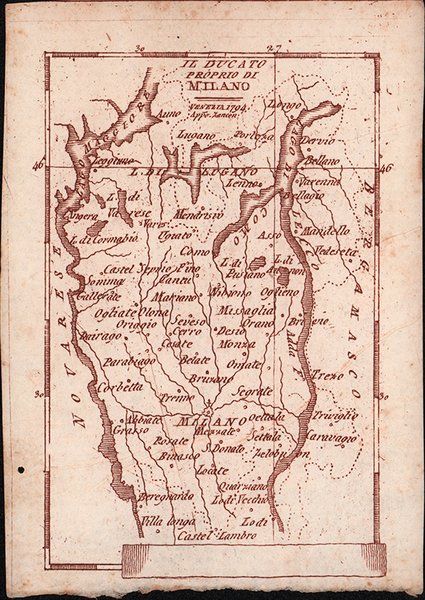 RARITA’ CARTOGRAFICA Sconosciuta piccola carta geografica con imprint di Pietro Zancon e data 1794, appartenente a un non documentato atlante in miniatura dal titolo “Atlante tascabile per le dame”, suddiviso in tre tomi, stampati “IN VENETIA Presso G. Zatta”, senza data ma circa 1795. Si tratta di carte da visita – con un apposito spazio bianco dove apporre il proprio nome – dove compare l’imprint o di Pietro Zancon (accompagnato dalla data 1794) o di Giacomo Zatta (con data 1794 o 1795), che, come si legge sul frontespizio, risulta l’editore dell’opera. Possiamo ipotizzare che la serie, iniziata da Zancon fu poi terminata dallo Zatta. Sulla carta dell’Italia – presumibilmente la prima tavola dell’opera – compare stampato il nome di Chiara Minelli Rota, nobildonna veneziana che sposò Antonio Rota nel 1794; tutte le restanti 65 carte recano lo spazio bianco privo di nome. In precedenza, le carte erano note solo attraverso una serie, priva di imprint editoriale, venduta 21 anni fa (1999) dall’Antiquariaat Haas di Bedburg Hau; parlando con Stephan Haas, la serie, priva di titolo e dati editoriali si componeva di 70 mappe. Le carte furono vendute separatamente sotto il nome di G. Bonatti, firma dell’incisore che si trova nella carta della Francia. In seguito, le tavole furono attribuite a Pietro Zaricen da Geoffrey King (cfr. Miniature Antique Maps, p. 181). Il nome dello Zaricen viene dedotto dalla carta della contea del Roussillon, che reca l’iscrizione “Venezia 1794 App.o P. Zancon”, letto erroneamente come Zaricen. Lajos Szantai include la carta dell’Ungheria nella sua cartobibliografia, traducendo il nome dell’autore in Zancen (cfr. Atlas Hungaricus 1528-1850). Sempre King, che non menziona nessuna carta firmata da Zatta, sostiene che “About the turn of the century a signed card of the first edition, with a map of the province of Roussillon in the south of France, was seen at an Ephemera Society Fair in London”. Questo esemplare sembrerebbe oggi quello conservato alla Yale University Library [1978 351], che lo descrive composto da 70 carte geografiche. Non sappiamo se sia il numero totale delle mappe, e l’assenza di un indice o dell’elenco non consente di stabilire l’esatto numero delle carte che lo compongono. http://hdl.handle.net/10079/bibid/3611852Confrontando le carte erroneamente attribuite allo Zaricen ci si accorge che la lastra è abrasa in corrispondenza della firma di Zancon o Zatta. Molto scarse sono le notizie sulle carte che possiamo ora definire “ex Zaricen”. Jason Hubbard nella sua bibliografia recente sulle carte del Giappone raffigura la carta priva dell’imprint “App.o G. Zatta” attribuendola - sulla base delle informazioni bibliografiche finora note – a Giuseppe Bonatti e Pietro Zaricen: “This is one of the 70-odd geographical cards, printed on one side only, acquired by the Haas brothers in 1999. The cards cover countries around the world and include detailed map of Italian provinces. The card with the map of France carries the inscription: G. Bonatti fece; and it is presumed that Bonatti engraved all of them although this is questioned by King” (cfr. J. Hubbard, Japoniae Insulae, n. 124). Il nostro esemplare della carta della Francia, che reca l’imprint “Venezia 1794, App.o P. Zancon” reca in basso a destra la firma di Bonatti sopra menzionata. Dunque, l’unica differenza tra questa serie di sconosciute carte sembra essere la presenza degli imprint editoriali di Zancon e Zatta, accompagnati dalla data 1794 o 1795. Giuseppe Bonatti è menzionato da V. Valerio nella qualità di incisore cresciuto alla scuola Remondini di Bassano, autore di alcune carte per l’atlante di Pazzini Carli (Siena, 1788-1800) e per l’Atlante Geografico di Carlo Antonio Barbiellini (Milano, 1807). Dal 1809 in poi lavorò come incisore per il Deposito della Guerra di Milano (cfr. V. Valerio, Cartografi Veneti, p. 153). Pietro Zancon era, assieme . A GREAT RARITY Unknown small map with imprint by Pietro Zancon and date 1794, belonging to an undocumented miniature atlas entitled “Atlante tascabile per le dame” (Pocket Atlas for ladies), divided into three volumes, printed "IN VENETIA Presso G. Zatta", undated but about 1795. A rare set of visiting cards published in Italy features pretty little maps of all parts of the world - with a special white space where to put your name - where the imprint appears or of Pietro Zancon (accompanied by the date 1794) or Giacomo Zatta (with the date 1794 or 1795), who, as can be read on the title page, is the publisher of the whole Atlas. We can speculate that the series, started by Zancon was later terminated by Zatta. On the map of Italy is printed - presumably the first map of the work - the name of Chiara Minelli Rota, Venetian noblewoman who married Antonio Rota in 1794; all remaining 65 maps bear the blank space without names. Previously, the maps were known only through a series, without editorial imprint, sold 21 years ago (1999) by the Antiquariaat Haas of Bedburg Hau; speaking with Stephan Haas, the series, without title and printing details, consisted of 70 maps. The maps were sold separately under the name of G. Bonatti, the engraver's signature found on the map of France. Later, the plates were attributed to Pietro Zaricen by Geoffrey King (see Miniature Antique Maps, p. 181). The name of Zaricen is derived from the Roussillon county map, which bears the inscription "Venice 1794 App.o P. Zancon", incorrectly read as Zaricen. Lajos Szantai includes the map of Hungary in his cartobibliography, translating the author's name into Zancen (see Atlas Hungaricus 1528-1850). Always King, who does not mention any map signed by Zatta, said: "About the turn of the century a signed card of the first edition, with a map of the province of Roussillon in the south of France, was seen at an Ephemera Society Fair in London ". This copy would seem to be the one preserved in the Yale 