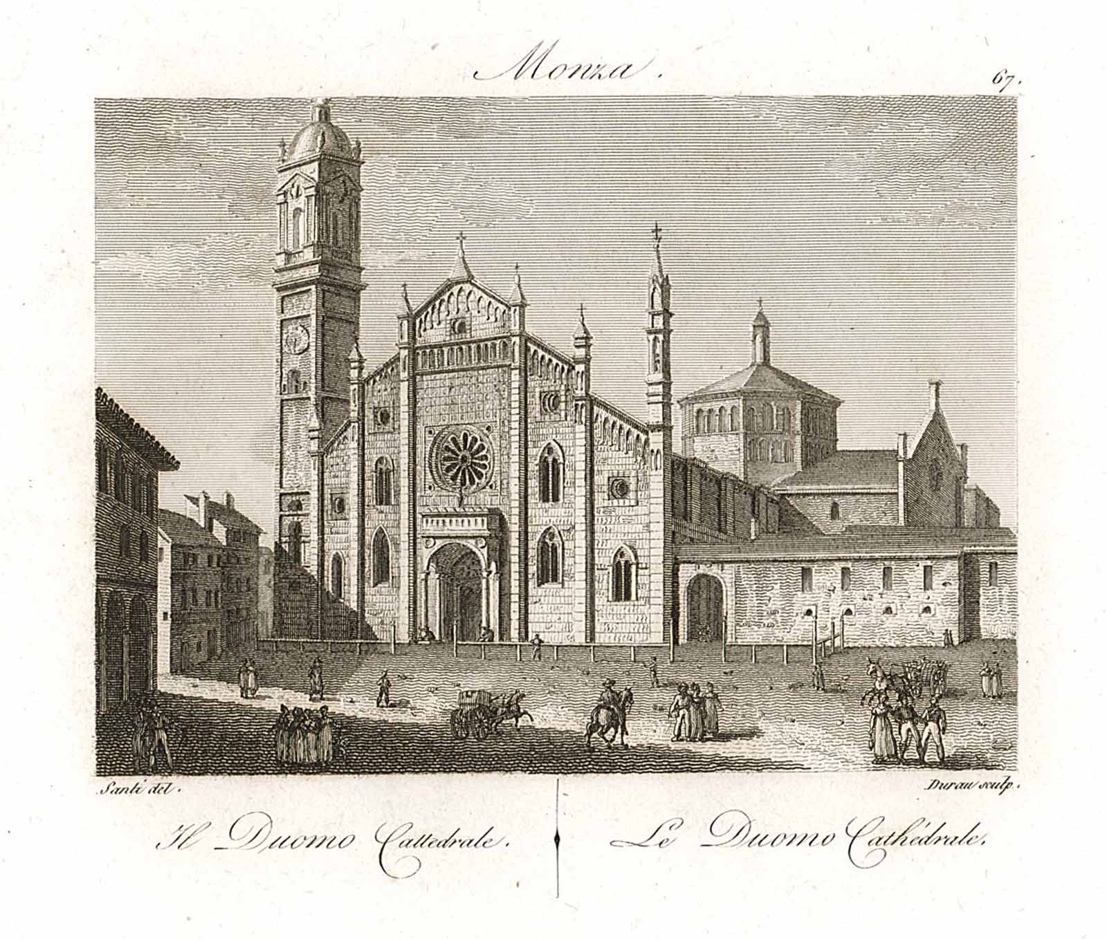 Piccola veduta, antica ed originale, della facciata del duomo. Piccole macchie d'umidità ai margini. Autore: Durau. Luogo: Monza. Anno: 1820. Tecnica: incisione in rame. Dimensioni: 69x93 mm