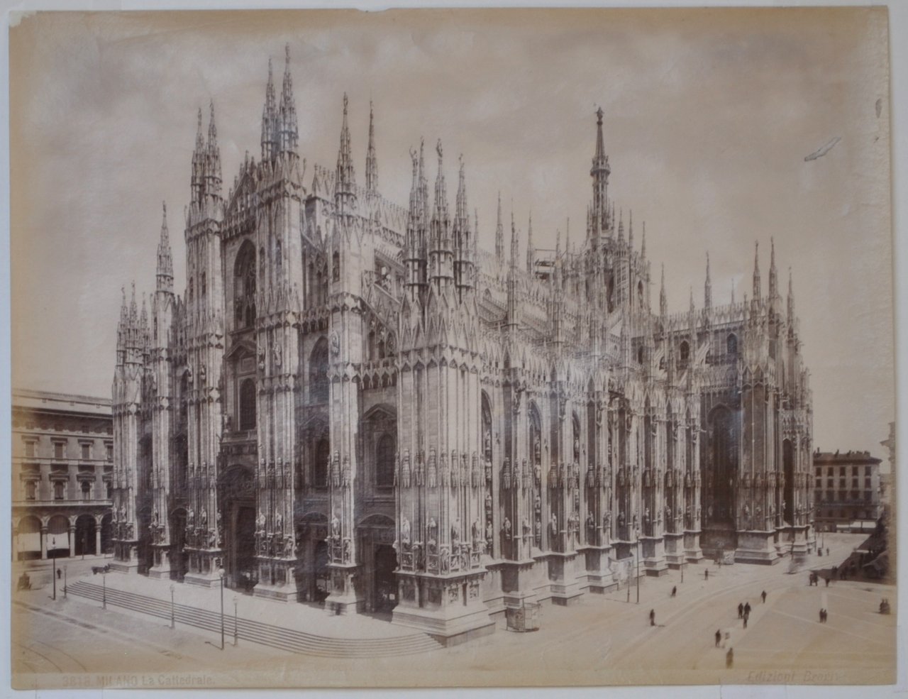 Fotografia all'albumina di mm 250 x 195. Buono stato di conservazione. In basso la dicitura "3818 Milano La Cattedrale" e più a destra "Edizioni Brogi" Lo stabilimento fotografico di Giacomo Brogi (1822-1881) venne fondato a Firenze nel 1864, e proseguì la sua attività, sotto la direzione del figlio Carlo, fino al 1950, rappresentando con le loro immagini un secolo di storia italiana.