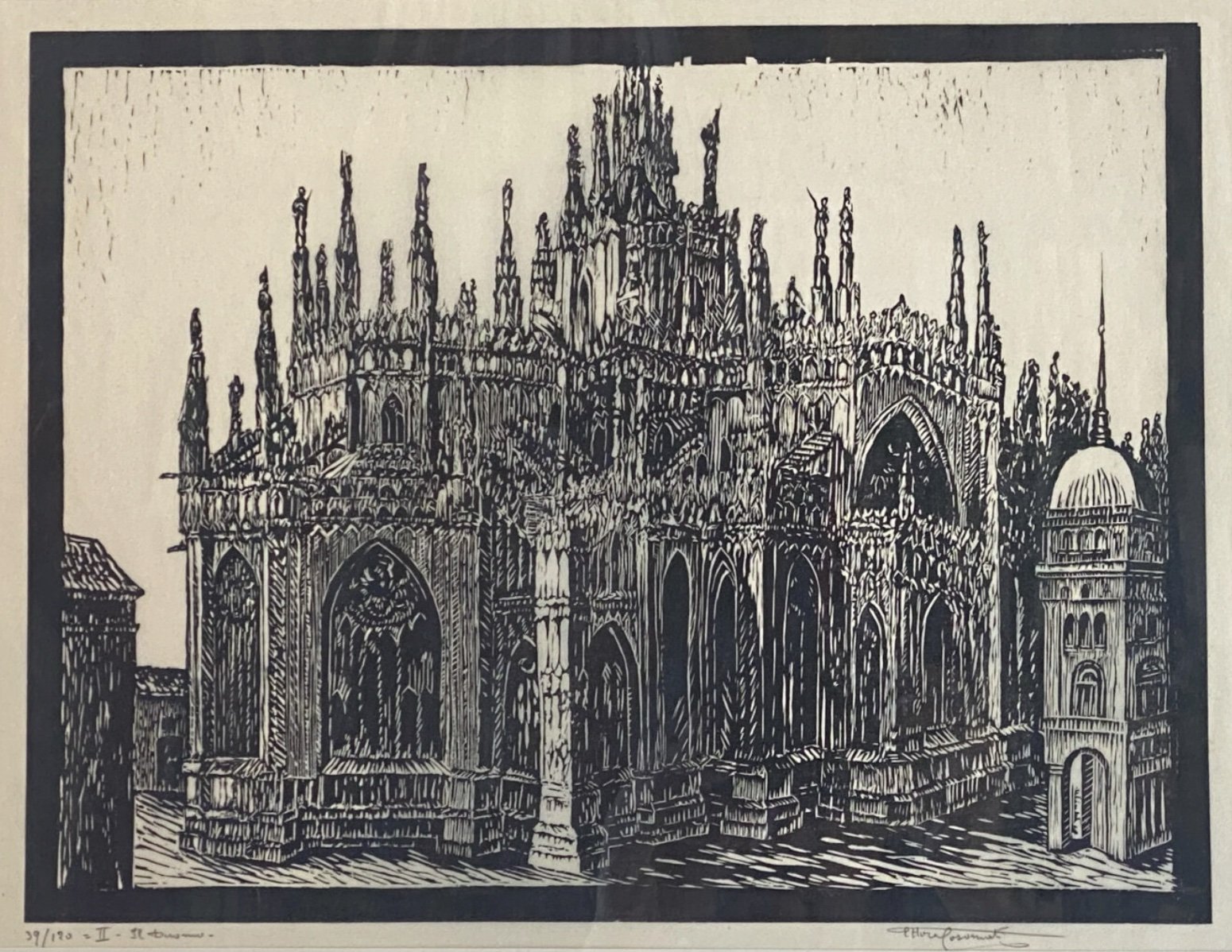 Mediante una prospettiva dall'alto che schiaccia la verticalità del Monumento l'autore rappresenta parte dell'abside esterno e il lato sinistro del Duomo così come si vede giungendo dall'attuale corso Vittorio Emanuele II. Il punto di vista ravvicinato esalta la massa dell'architettura che sembra quasi uscire dalla linea di contorno. Interessante è l'utilizzo della carta come elemento cromatico. L'anomalia dimensionale delle guglie e la sproporzione con gli edifici circostanti infonde un senso di fiaba alla composizione. Tiratura di 190 esemplari. In basso a sinistra è scritto:  n 39/190 = II = Il Duomo;  a destra la firma dell'autore. Il n II potrebbe indicare una seconda tiratura o più probabilmente una seconda tavola dedicata al Duomo.