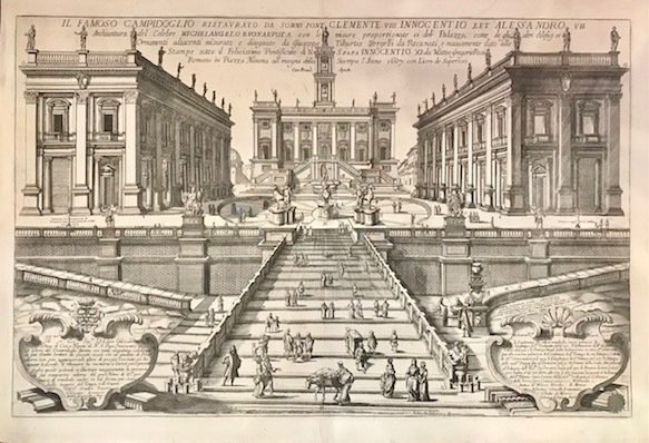 Il famoso Campidoglio ristaurato da sommi Pont. Clemente VIII, Innocentio X et Alessandro VII. Architettura del celebre Michelangelo Buonaruota, con le misure proportionate si del Palazzo, come de gli altri edeficj et Ornamenti adiacenti misurato, e disegnato da Giuseppe Tiburtio Vergelli da Recanati, e nuovamente dato alle stampe sotto il felicissimo pontificato di N.S. Papa Innocentio XI da Matteo Gregorio Rossi romano in Piazza Navona all’insegna della Stampa l’anno 1687