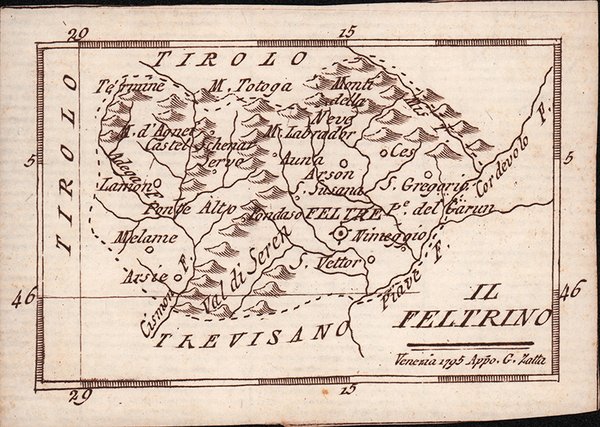 RARITA’ CARTOGRAFICA Sconosciuta piccola carta geografica con imprint di Giacomo Zatta e data 1795, appartenente a un non documentato atlante in miniatura dal titolo “Atlante tascabile per le dame”, suddiviso in tre tomi, stampati “IN VENETIA Presso G. Zatta”, senza data ma circa 1795. Si tratta di carte da visita – con un apposito spazio bianco dove apporre il proprio nome – dove compare l’imprint o di Pietro Zancon (accompagnato dalla data 1794) o di Giacomo Zatta (con data 1794 o 1795), che, come si legge sul frontespizio, risulta l’editore dell’opera. Possiamo ipotizzare che la serie, iniziata da Zancon fu poi terminata dallo Zatta. Sulla carta dell’Italia – presumibilmente la prima tavola dell’opera – compare stampato il nome di Chiara Minelli Rota, nobildonna veneziana che sposò Antonio Rota nel 1794; tutte le restanti 65 carte recano lo spazio bianco privo di nome. In precedenza, le carte erano note solo attraverso una serie, priva di imprint editoriale, venduta 21 anni fa (1999) dall’Antiquariaat Haas di Bedburg Hau; parlando con Stephan Haas, la serie, priva di titolo e dati editoriali si componeva di 70 mappe. Le carte furono vendute separatamente sotto il nome di G. Bonatti, firma dell’incisore che si trova nella carta della Francia. In seguito, le tavole furono attribuite a Pietro Zaricen da Geoffrey King (cfr. Miniature Antique Maps, p. 181). Il nome dello Zaricen viene dedotto dalla carta della contea del Roussillon, che reca l’iscrizione “Venezia 1794 App.o P. Zancon”, letto erroneamente come Zaricen. Lajos Szantai include la carta dell’Ungheria nella sua cartobibliografia, traducendo il nome dell’autore in Zancen (cfr. Atlas Hungaricus 1528-1850). Sempre King, che non menziona nessuna carta firmata da Zatta, sostiene che “About the turn of the century a signed card of the first edition, with a map of the province of Roussillon in the south of France, was seen at an Ephemera Society Fair in London”. Questo esemplare sembrerebbe oggi quello conservato alla Yale University Library [1978 351], che lo descrive composto da 70 carte geografiche. Non sappiamo se sia il numero totale delle mappe, e l’assenza di un indice o dell’elenco non consente di stabilire l’esatto numero delle carte che lo compongono. http://hdl.handle.net/10079/bibid/3611852Confrontando le carte erroneamente attribuite allo Zaricen ci si accorge che la lastra è abrasa in corrispondenza della firma di Zancon o Zatta. Molto scarse sono le notizie sulle carte che possiamo ora definire “ex Zaricen”. Jason Hubbard nella sua bibliografia recente sulle carte del Giappone raffigura la carta priva dell’imprint “App.o G. Zatta” attribuendola - sulla base delle informazioni bibliografiche finora note – a Giuseppe Bonatti e Pietro Zaricen: “This is one of the 70-odd geographical cards, printed on one side only, acquired by the Haas brothers in 1999. The cards cover countries around the world and include detailed map of Italian provinces. The card with the map of France carries the inscription: G. Bonatti fece; and it is presumed that Bonatti engraved all of them although this is questioned by King” (cfr. J. Hubbard, Japoniae Insulae, n. 124). Il nostro esemplare della carta della Francia, che reca l’imprint “Venezia 1794, App.o P. Zancon” reca in basso a destra la firma di Bonatti sopra menzionata. Dunque, l’unica differenza tra questa serie di sconosciute carte sembra essere la presenza degli imprint editoriali di Zancon e Zatta, accompagnati dalla data 1794 o 1795. Giuseppe Bonatti è menzionato da V. Valerio nella qualità di incisore cresciuto alla scuola Remondini di Bassano, autore di alcune carte per l’atlante di Pazzini Carli (Siena, 1788-1800) e per l’Atlante Geografico di Carlo Antonio Barbiellini (Milano, 1807). Dal 1809 in poi lavorò come incisore per il Deposito della Guerra di Milano (cfr. V. Valerio, Cartografi Veneti, p. 153). Pietro Zancon era, assieme . A GREAT RARITY Unknown small map with imprint by Giacomo Zatta and date 1795, belonging to an undocumented miniature atlas entitled “Atlante tascabile per le dame” (Pocket Atlas for ladies), divided into three volumes, printed "IN VENETIA Presso G. Zatta", undated but about 1795. A rare set of visiting cards published in Italy features pretty little maps of all parts of the world - with a special white space where to put your name - where the imprint appears or of Pietro Zancon (accompanied by the date 1794) or Giacomo Zatta (with the date 1794 or 1795), who, as can be read on the title page, is the publisher of the whole Atlas. We can speculate that the series, started by Zancon was later terminated by Zatta. On the map of Italy is printed - presumably the first map of the work - the name of Chiara Minelli Rota, Venetian noblewoman who married Antonio Rota in 1794; all remaining 65 maps bear the blank space without names. Previously, the maps were known only through a series, without editorial imprint, sold 21 years ago (1999) by the Antiquariaat Haas of Bedburg Hau; speaking with Stephan Haas, the series, without title and printing details, consisted of 70 maps. The maps were sold separately under the name of G. Bonatti, the engraver's signature found on the map of France. Later, the plates were attributed to Pietro Zaricen by Geoffrey King (see Miniature Antique Maps, p. 181). The name of Zaricen is derived from the Roussillon county map, which bears the inscription "Venice 1794 App.o P. Zancon", incorrectly read as Zaricen. Lajos Szantai includes the map of Hungary in his cartobibliography, translating the author's name into Zancen (see Atlas Hungaricus 1528-1850). Always King, who does not mention any map signed by Zatta, said: "About the turn of the century a signed card of the first edition, with a map of the province of Roussillon in the south of France, was seen at an Ephemera Society Fair in London ". This copy would seem to be the one preserved in the Yale 