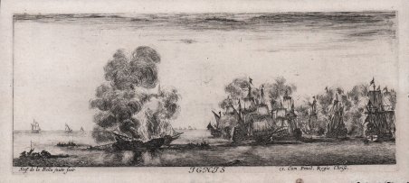 Flotta di navi in fiamme; in mare, una nave al centro e una flotta di navi a destra, tutte avvolte dalle fiamme, con una barca a remi piena di persone in primo piano a sinistra. Dalla serie I quattro elementi. Acquaforte, 1648 circa, incisa nel margine sotto l'immagine con titolo e dettaglio della produzione: "Stef. de la Bella inventit" e con privilegio reale: "ex. Cum Privil. Regis Christ". Bella impressione su carta vergata coeva, con margini sottili, buono stato di conservazione. Stefano della Bella fu uno degli incisori più interessanti e originali nella Firenze del XVII secolo e può considerarsi l’unico geniale continuatore dell’opera di Jacques Callot. La sua educazione artistica ebbe inizio a Firenze nella bottega degli orafi Gasparo Mola e Orazio Vanni, e la precisione del segno, tipica dell’arte orafa resterà caratteristica del suo stile. Studiò poi presso Giovanni Battista Vanni e forse anche presso il Cantagallina e Cesare Dandini, ma ben presto si dedicò all'incisione. Il suo vero maestro può considerarsi Jacques Callot, l’incisore francese che soggiornò a lungo a Firenze lasciando una forte impronta nel panorama artistico della città. Gli anni più importanti della sua carriera sono quelli che trascorre a Parigi, dal 1639 al 1650, stipendiato da Lorenzo de' Medici: lavorò insieme ad Israel Silvestre, con gli editori Langlois, Ciartres e Pierre Mariette, per stampatori francesi e per commissioni di gran prestigio, come quelle del 1641 per il cardinale Richelieu che gli affidò le illustrazioni delle sue imprese guerresche. Intorno al 1647, durante un viaggio in Olanda, dove eseguì le acqueforti con le vedute del porto di Amsterdam, incontrò Rembrandt e da quella data notiamo una eco profonda dell’arte dell’olandese nella grafica del Della Bella. Bibliografia De Vesme - Massar Stefano della Bella (1971) n. 756, I/III. Fleet of ships on fire; in the sea, one ship at centre and a fleet of ships to right, all engulfed in flames, with a rowing boat full of people at front left. From the series of ' Four Elements. Etching, circa 1648, ettered in margin below image with title, production detail: "Stef. de la Bella invent fecit" and with royal privilege: "ex. Cum Privil. Regis Christ." A fine impression on contemporary laid paper, with thin margins, good condition. Massar is incorrect in stating that the series must predate 1647 as that was the year of death of the publisher Langlois, whose name appears on the third state. However, it was François Langlois who died in 1647, while the name is given on the prints as "NLanglois" in reference to Nicolas. As he was François's son there are no such constrictions of ' date for the production of the series. Stefano della Bella was one of the most interesting and original engravers in 17th-century Florence and can be considered the only brilliant continuator of Jacques Callot's work. His artistic education began in Florence in the workshop of the goldsmiths Gasparo Mola and Orazio Vanni, and the precision of sign, typical of the goldsmith's art, will remain characteristic of his style. He then studied under Giovanni Battista Vanni and perhaps also under Cantagallina and Cesare Dandini, but soon turned to engraving. His real master can be considered Jacques Callot, the French engraver who stayed in Florence for a long time and left a strong imprint on the city's artistic scene. The most important years of his career were the ones he spent in Paris, from 1639 to 1650, salaried by Lorenzo de' Medici: he worked together with Israel Silvestre, with the publishers Langlois, Ciartres and Pierre Mariette, for French printers and for commissions of great prestige, such as those of 1641 for Cardinal Richelieu, who entrusted him with illustrations of his warlike exploits. Around 1647, during a trip to Holland, where he executed etchings with views of the port of Amsterdam, he met Rembrandt, and from that date we note a profound echo of the Dutchman's art in Della Bella's graphic work. Bibliografia De Vesme - Massar Stefano della Bella (1971) n. 756, I/III. Cfr.