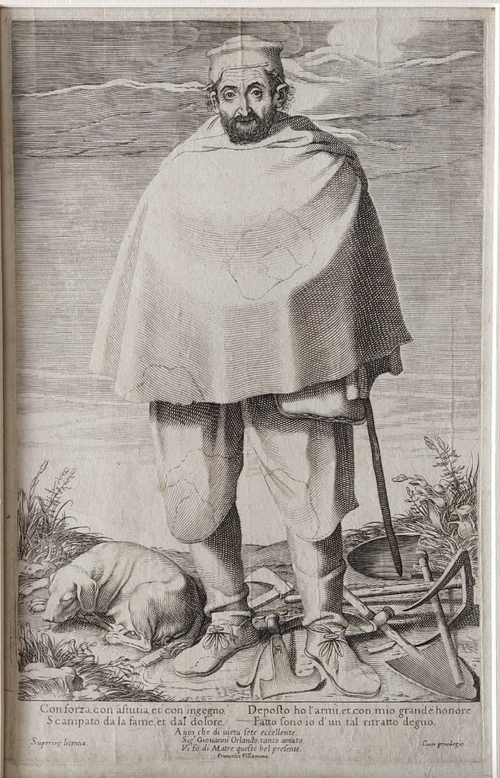 Neri delicati fatta eccezione per l'abile incrocio di linee che crea netti contrasti chiaroscurali. Ottimo stato di conservazione. Ampi margini oltre la battuta del rame. Monogrammato in lastra al centro sulla lama di uno strumento del mestiere. Nel margine inferiore iscrizione: "Con forza con astutia, et con ingegno / Scampato de la fame, et dal dolore / Deposto ho l'armi, et con mio grande honore / Fatto sono io d'un tal ritratto degno '. Di seguito: 'A voi che di virtu siete eccellente / Sig. Giovanni Orlando, tanto amato, / Vi fa di Matre questo bel presente. "Con Superior licentia / Francesco Villamena / cum privilegio".