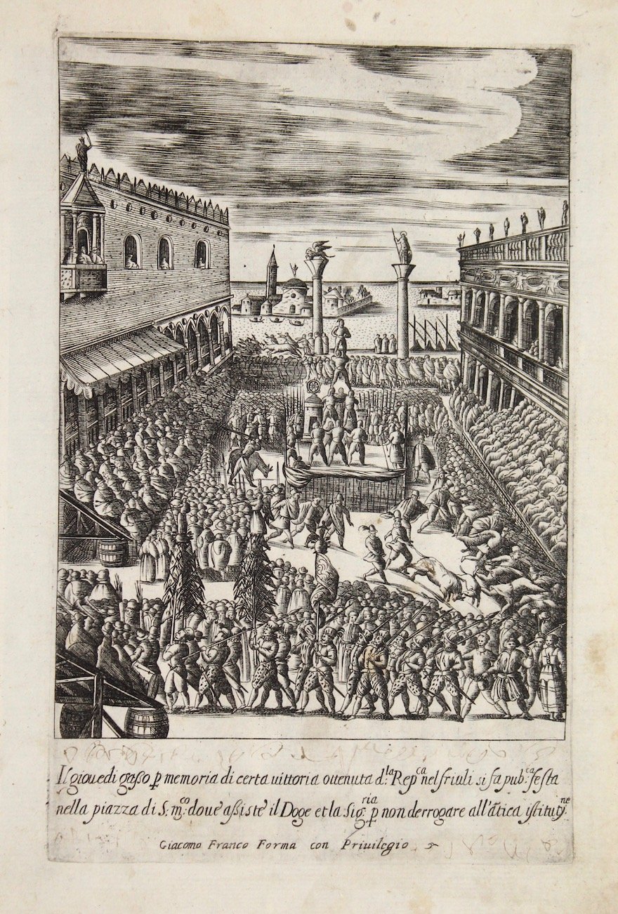 Acquaforte, ottima impressione su carta vergata, mm 247x156, firmata "Giacomo Franco Forma con privilegio" in basso, tratta dalla raccolta "Habiti d'huomeni et donne veneziane…Trionfi Feste Cerimonie pubbliche della mobilissima città di Venetia", che si proponeva di illustrare in ogni aspetto la vita cittadina, inclusi i giochi che dividevano la cittadinanza in due squadre. La raccolta venne pubblicata dopo il 1591, anno in cui Franco ottenne il privilegio di stampa dal senato. Foglio in ottime condizioni con buoni margini con minime tracce di sporco superficiale e piccole macchie marginali. Traccie illeggibili di scrittura manoscritta sopra il titolo. Piccola mancanza di carta all'angolo superiore destro. <BR>