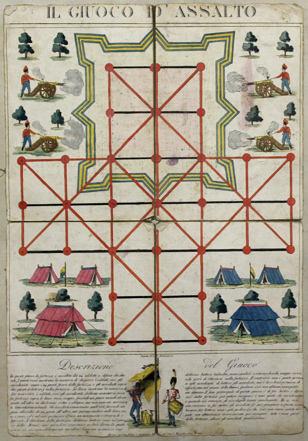 Foglio inciso in rame (mm 295x420) acquarellato coevo, diviso in quattro stacchi montati su tela. Rappresenta il gioco d'assalto rompicapo francese, consiste nell'assalto da parte di 24 soldati ad una fortezza disegnata al centro della tavola, ai quattro angoli riquadri soldati con cannoni e accampamenti. Come nel gioco della dama è disegnata una sorta di scacchiera dove le pedine si muovono secondo le regole, mentre il fine principale del gioco è di far sortire i difensori dalla fortezza per occupare i nove punti che vi si trovano.<BR>In basso legenda con le spiegazioni del gioco al centro due soldati con tamburi e stendardo. Bell'esemplare.<BR>