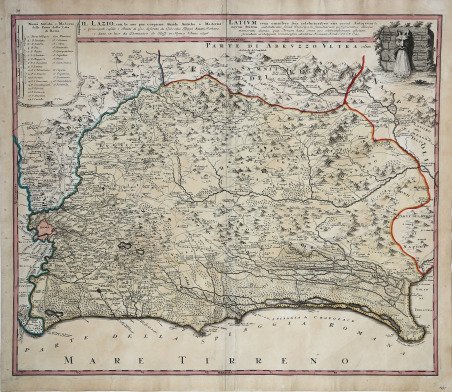Carta geografica del basso Lazio pubblicata a Norimberga dalla tipografia Homann. La carta deriva da quella di Giacomo Ameti edita a Roma nel 1696. Johann Baptist Homann è stato un geografo e cartografo tedesco; nel 1702 fondò la sua casa editrice. Homann acquisì fama come uno dei principali cartografi tedeschi, e nel 1715 fu nominato geografo imperiale dall'imperatore Carlo VI. Nello stesso anno fu anche nominato membro dell'Accademia Prussiana delle Scienze a Berlino. Nel 1716 Homann pubblicò il suo capolavoro Grosser Atlas ueber die ganze Welt. Numerose mappe furono redatte in collaborazione con l'incisore Christoph Weigel. Homann morì a Norimberga nel 1724. Gli successe suo figlio Johann Christoph (1703-1730). L'azienda continuò dopo la sua morte come azienda degli eredi Homann, gestita da Johann Michael Franz e Johann Georg Ebersberger. Dopo successivi cambiamenti nella gestione, l'azienda si sciolse nel 1852. ' Incisione in rame, coloritura coeva, in ottimo stato di conservazione. Map of the Lower Lazio published in Nuremberg by the Homann typography. Johann Baptist Homann was a German geographer and cartographer; in 1702 he founded his own publishing house. Homann acquired renown as a leading German cartographer, and in 1715 was appointed Imperial Geographer by Emperor Charles VI. In the same year he was also named a member of the Prussian Academy of Sciences in Berlin. In 1716 Homann published his masterpiece Grosser Atlas ueber die ganze Welt; numerous maps were drawn up in cooperation with the engraver Christoph Weigel the Elder. Homann died in Nuremberg in 1724 and was succeeded by his son Johann Christoph (1703-1730). The company carried on upon his death as Homann heirs company, managed by Johann Michael Franz and Johann Georg Ebersberger. After subsequent changes in management the company folded in 1852. ' Etching with fine original colour, good condition. Cfr. Istituto di Studi Romani, a cura di A. Frutaz, "Le Carte del Lazio", XXXIII. 1a, tav. 174