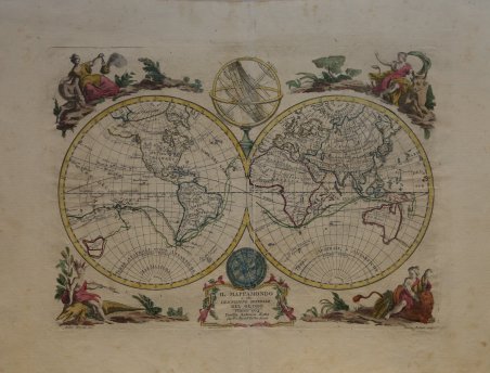 PRIMA EDIZIONE del mappamondo di Zatta con i due emisferi, edito a Venezia ne 1774.La mappa riporta le scoperte, allora recenti, del capitano Cook, successive a quelle in Australia e Nuova Zelanda. Di notevole interesse anche la cartografazione aggiornata della costa nord-occidentale dell'America, inclusa l'area del Pacifico. Di grande impatto decorativo, la carta è arricchita ai lati con quattro figure allegoriche dei quattro continenti. Carta geografica tratta dall’Atlante novissimo, illustrato ed accresciuto sulle osservazioni e scoperte fatte dai più celebri e più recenti geografi. Stampato in quattro volumi da Antonio Zatta tra il 1779 ed il 1785. Atlante fra i più belli e completi mai pubblicati in Italia nel XVIII secolo, l'opera più famosa dello Zatta. L’Atlante Novissimo, come si specifica anche nel titolo, è “accresciuto sulle osservazioni scoperte fatte dai più celebri e più recenti geografi”. Tra le novità più significative vi è la comparsa delle nuove isole scoperte nell'Oceano Pacifico da James Cook e la prima carta italiana della Nuova Zelanda. Le illustrazioni furono ' ideate e disegnate dai suoi collaboratori Giovanni Marco Pitteri, Anton Friedrich Busching, Pietro Antonio Novelli ed incise da Giuliano Zuliani. Il primo tomo dell’atlante è introdotto da un breve saggio di geografia generale dove l’autore definisce in modo sintetico e preciso gli elementi che compongono i reticoli eclittico ed equatoriale usati nelle tavole. Interessante la sezione dove si sofferma ' a descrivere il fenomeno della precessione degli equinozi e quello della variazione ciclica dell'obliquità dell'eclittica. Acquaforte, stampata su carta vergata coeva, coloritura coeva dei contorni, in buone condizioni. First edition of Antonio Zatta's decorative double hemisphere map of the World, published in Venice in 1774.Includes allegorical vignettes of the 4 continents, embellishing the outer corners.The map depicts the recent discoveries of Captain James Cook, immediately following his discoveries in New Zealand and Australia.The depiction of New Zealand is especially fascinating.The map also includes interesting updated cartographic details along the Northweast Coast of America, including the Sea of the West. Map from the Atlante novissimo, illustrato ed accresciuto sulle osservazioni e scoperte fatte dai più celebri e più recenti geografi. Printed in four volumes by Antonio Zatta between 1779 and 1785. ' Atlas among the most beautiful and complete ever published in Italy in the eighteenth century, the most famous work of Zatta. The Atlante Novissimo, as also specified in the title, is “increased on the observations made by the most famous and most recent geographers”. Among the most significant innovations there is the appearance of the new islands discovered in the Pacific Ocean by James Cook and the first Italian map of New Zealand. The illustrations were designed and drawn by his collaborators Giovanni Marco Pitteri, Anton Friedrich Busching, Pietro Antonio Novelli and engraved by Giuliano Zuliani. The first volume of the atlas is introduced by a brief essay of general geography where the author defines in a concise and precise way the elements that make up the ecliptic and equatorial grids used in the tables. Interesting is the section where he pauses to describe the phenomenon of precession of the equinoxes and the cyclical variation of the obliquity of the ecliptic. Etching, printed on contemporary laid paper, contemporary outline coloring, in good condition. Cfr.