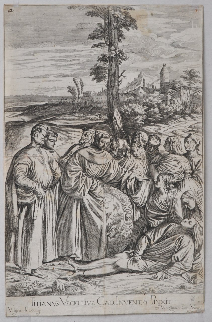 Acquaforte di mm 271 x 426 su carta di filo. La stampa, pubblicata nell'"Opera Selectiora" riproduce in controparte uno degli affreschi dipinti da Tiziano nella Scuola del Santo di Padova.
