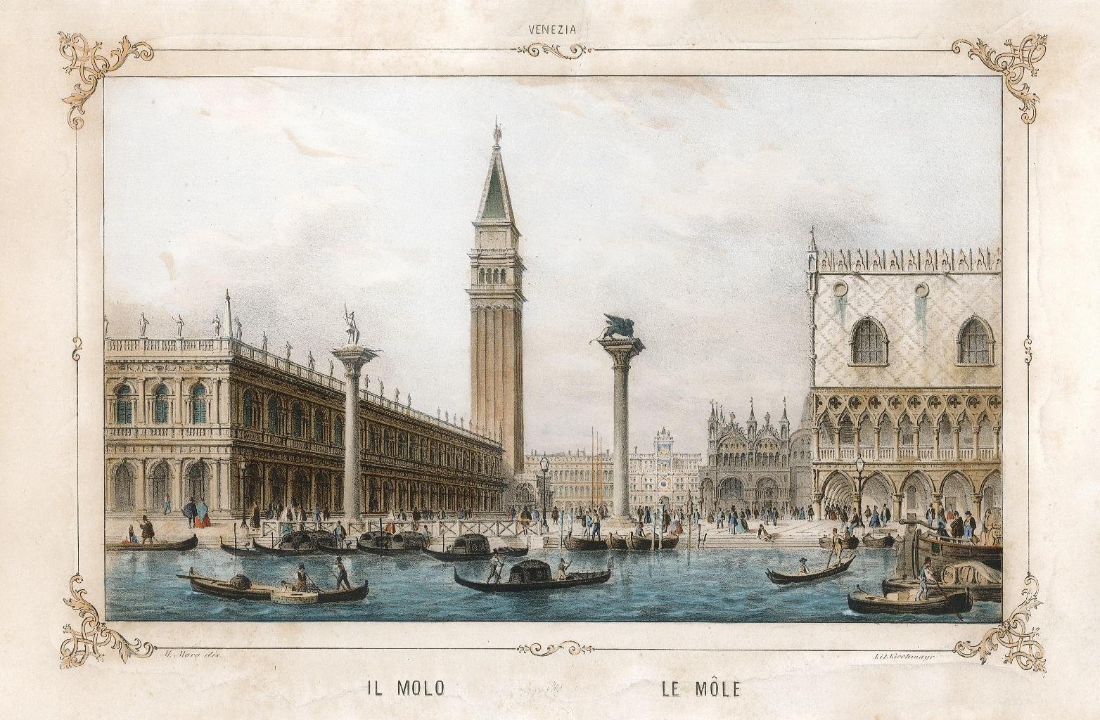 Stampa, antica ed originale, molto animata in bella coloritura coeva che raffigura il molo e piazza San Marco