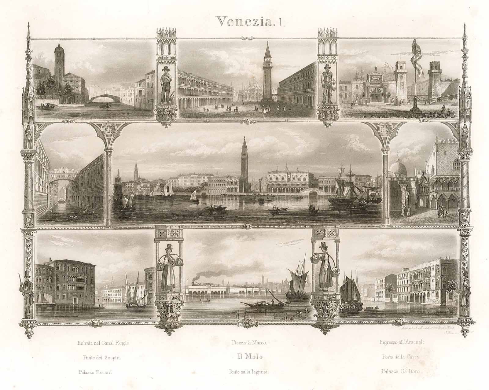 Graziosa veduta multipla arricchita da una decorativa cornice a motivi architettonici tra cui si inseriscono alcuni personaggi quali la venditrice di latte, il fruttivendolo etc. Al centro la veduta del Molo di Venezia e tutto intorno alcuni scorci della città: Entrata nel canal Regio, Piazza San Marco, Ingresso all'Arsenale, Porta della Carta, Palazzo Cà Doro, Ponte sulla laguna, Palazzo Foscari, Ponte dei Sospiri.