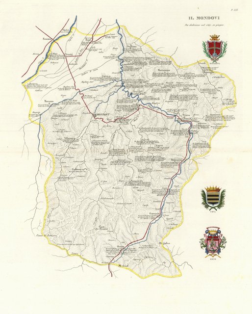 Carta geografica comprendente il territorio di Mondovì, Trinità, Dogliano, Carrù, Murazzano, Monesiglio, Morozzo, Ceva, Priero, Frabosa, Bagnasco, Pamparato, Garessio e Ormea e dintorni . Straodinaria è la coloritura coeva con stemmi di Mondovì, Ceva, e Bene, miniati e rialzati in oro ed argento. Ottimo lo stato di conservazione con ampi margini. Piega centrale editoriale cd2606