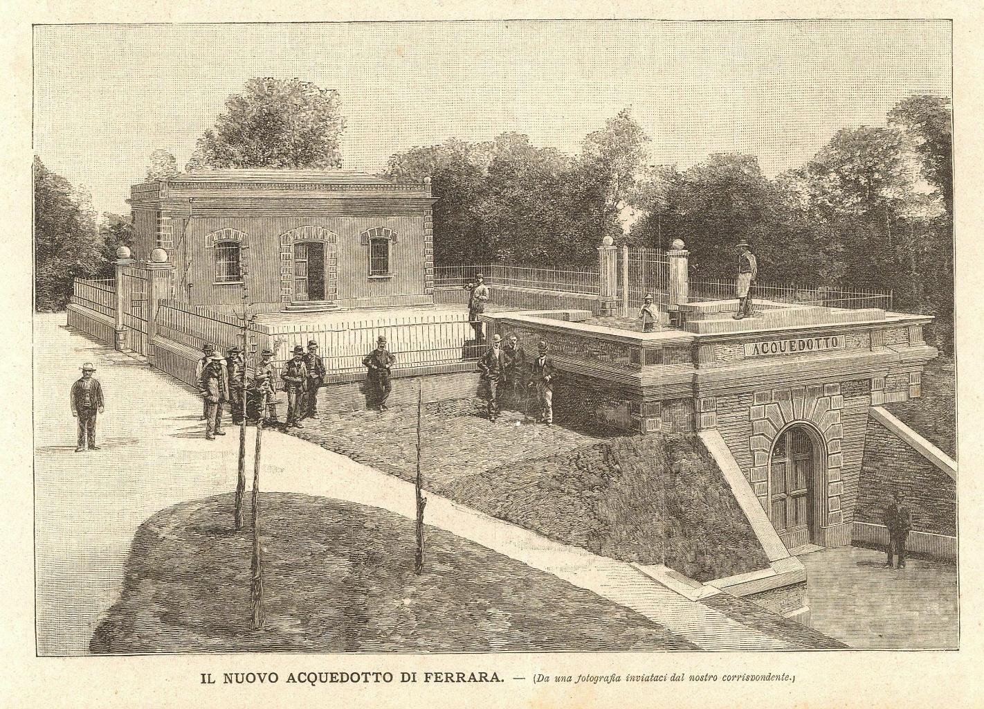 Stampa, antica ed originale, con raffigurazione degli edifici del nuovo acquedotto. Testo al verso. Autore: anonimo. Luogo: Ferrara. Anno: 1890. Tecnica: xilografia. Dimensioni: 168x246.