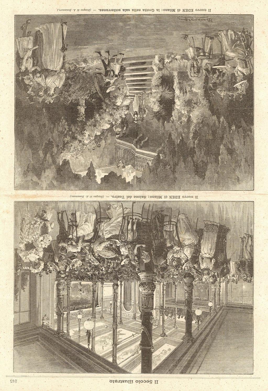Stampa, antica ed originale, con raffigurazione di due vedute su unico foglio dell'Eden: il salone del teatro e la Grotta nella sala sotterranea. Testo al verso. Autore: Bonamore A. dis. Luogo: Milano. Anno: 1890. Tecnica: xilografia. Dimensioni: 360x240.