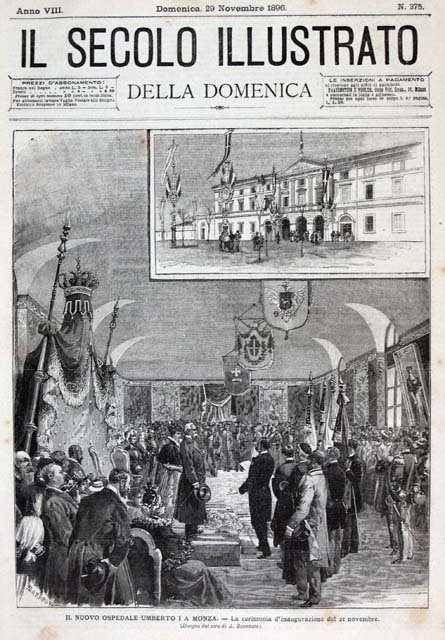 Veduta della facciata e della cerimonia d'inaugurazione del nuovo ospedale di Monza. Testo al verso
