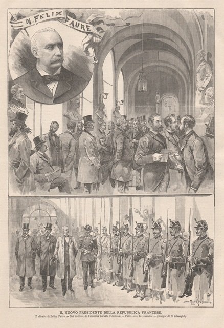 Composizione di vignette: in alto il ritratto di Félix Faure, al centro veduta dei corridoi di Versailles durante l’elezione e in basso l’uscita del nuovo presidente dal castello. Eletto il 17 gennaio 1895 fino al 16 febbraio 1899, giorno della sua morte. Testo al retro