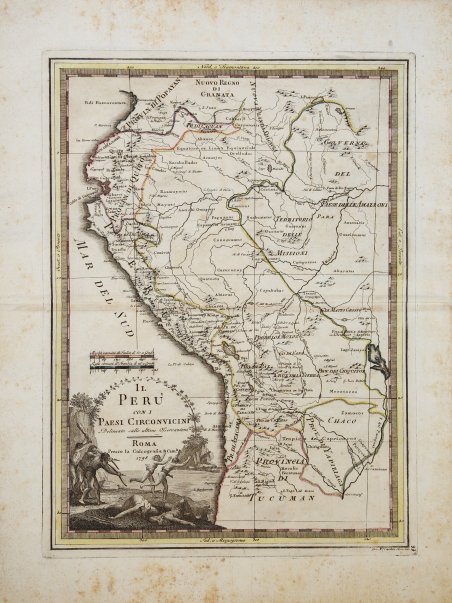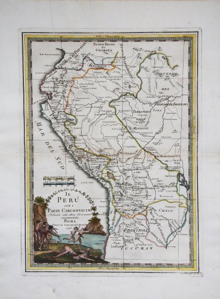 - ' PRIMA EDIZIONE ' – Mappa raffigurante i Perù e l’Ecuador, con un bellissimo cartiglio decorativo. Importante e decorativa mappa tratta dal "Nuovo Atlante Geografico Universale delineato sulle ultime osservazioni", edito a Roma dal 1792 fino al 1801, opera che la Calcografia Camerale commissionò al Cassini al fine di sostituire l’ormai obsoleto "Mercurio Geografico". Giovanni Maria Cassini, Chierico Regolare Somasco fu geografo e cartografo, ma anche intagliatore di architetture e prospettive - uno dei migliori discepoli di Giovanni Battista Piranesi - Cassini fu uno degli ultimi sferografi italiani del Settecento ed i suoi globi ebbero una notevole diffusione, come pure questo "Nuovo Atlante Geografico". L'Atlante del Cassini fu ristampato dalla Calcografia Camerale nel primo quarto del XIX secolo, prima del 1839. Solo gli esemplari di prima edizione come questo sono stampati su carta vergata coeva e sono colorati a mano in epoca. Le tirature del XIX secolo sono già su carta meccanica, priva di vergelle, e generalmente in bianco e nero. Acquaforte, coloritura coeva con ritocchi di colore nel cartiglio, in ottimo stato di conservazione. - FIRST EDITION - An uncommon map of Peru & Ecuador, published in the 'Nuovo Atlante Geografico Universale', with a decorative title cartouche. The Italian painter and engraver, Giovanni Maria Cassini, produced this attractive map as part of his epic three-volume atlas, the Nuovo atlante geografico universale delineato sulle ultime osservazioni. ' Roma, Calcografia Camerale, 1792-1801. Cassini was geographer and cartographer, but he was also good at engraving architectural items and perspectives – he was one of the best disciples Giovanni Battista Piranesi had. Moreover, Cassini was one of the last artists to engrave spheres in the XVIII century and his globes were quite famous and widespread, and realized the most important Italian Atlas of the XVIII century; his maps always bear a cartouche, extremely rich in colours and details. Cassini's Atlas was reprinted by the Calcografia Camerale in the first quarter of the 19th century, before 1839. Only the first edition examples - such as this one - are printed on contemporary laid paper and are hand-colored. Nineteenth-century editions are already on wove paper, lacking and uncolored. Copperplate with fine original hand colour with addition on the cartouche, in very good condition. Cfr.
