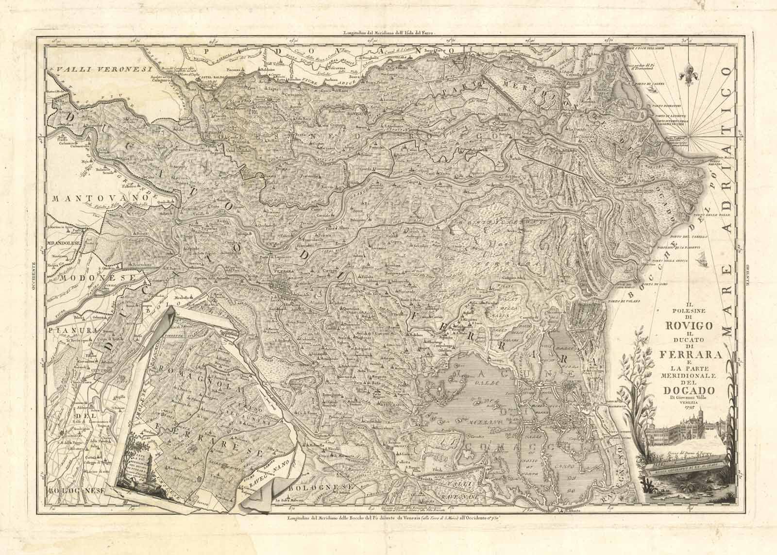 Carta geografica, entro margine graduato, raffigurante il Ducato di Ferrara e parte dei territori confinanti, nello specifico il Polesine di Rovigo e la parte meridionale del Dogado; sono altresì indicati i territori confinanti quali le Valli Veronesi, il Mantovano, il Modenese, il Bolognese, Imolese e Ravegnano. Il titolo si trova iscritto, nell'angolo in basso a destra, in decorativo cartiglio in cui compare la raffigurazione della piazza del Duomo di Ferrara e l'indicazione della scala grafica in Miglia Geografici di LX al grando. Si nota immediatamente la cura nel tracciamento del confine del Ducato e particolare risulta la scelta di raffigurare quella porzione di territorio meridionale che sarebbe finita extra margine "Parte la più meridionale del Ducato di Ferrara Va unito al Torrente Silaro sotto al foglio" come parte di un foglio applicato con degli spilli. Rara carta "ben eseguita e chiara" (Marinelli 1881: 1282) in cui è interessante notare "la sistematica ricognizione dei piccoli paesi e frazioni che non si riscontrano in nessun altra mappa del territorio" (Alberghini-Cavicchi 2008: p. 110) Ottimo stato di conservazione generale, impressione fresca, foglio in barbe.Di Giovanni Valle, autore della presente carta, sappiamo che nacque a Capodistria nel 1752 e che morì a Venezia nel 1819, dopo aver lavorato come cartografo alle dipendenze prima della serenissima e poi dei Governi francese e austriaco. Della sua abbondante produzione resta traccia in numerose raffigurazioni, tra le quali, oltre a quelle dell'Istria, si segnalano soprattutto, una veduta di Parenzo del 1775, una bellissima pianta di Padova, conservata in disegno autografo, datato 1781, presso l'Accademia Patavina di Scienze, Lettere ed Arti, e poi pubblicata a Roma nel 1784, ed alcune carte relative al Polesine, con il ducato di Ferrara, del Padovano e del Polesine di Rovigo. Sappiamo anche che, su commissione del Procuratore di Pesaro, egli aveva iniziato una carta del Dogado, lasciata poi incompiuta, per la sopravvenuta caduta della Repubblica e che, nel 1806, si era accollato il compito di eseguire una carta di tutta Italia. Inoltre si apprende da una sua lettera, che, nel 1816, con l'aiuto di numeroso personale, attendeva a disegnare otto grandi carte idrografiche delle province venete, comprese tra il Mincio e l'Isonzo ed altre ventitre delle stesse province, con la rappresentazione della nuova divisione territoriale. Rif: Marinelli 1881: 1282; Lago-Rossit 1981: p. 252; Albertini-Cavicchi 2008:
