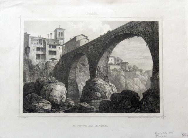 Trieste, 1860 circa. Incisione su acciaio, b/n, cm 14,3 x 20,7 (la parte figurata) più margini. Piacevole piccola veduta di Cividale del Friuli con lo scorcio dal basso del vecchio ponte in primo piano e case all'estremità. Discreta conservazione.
