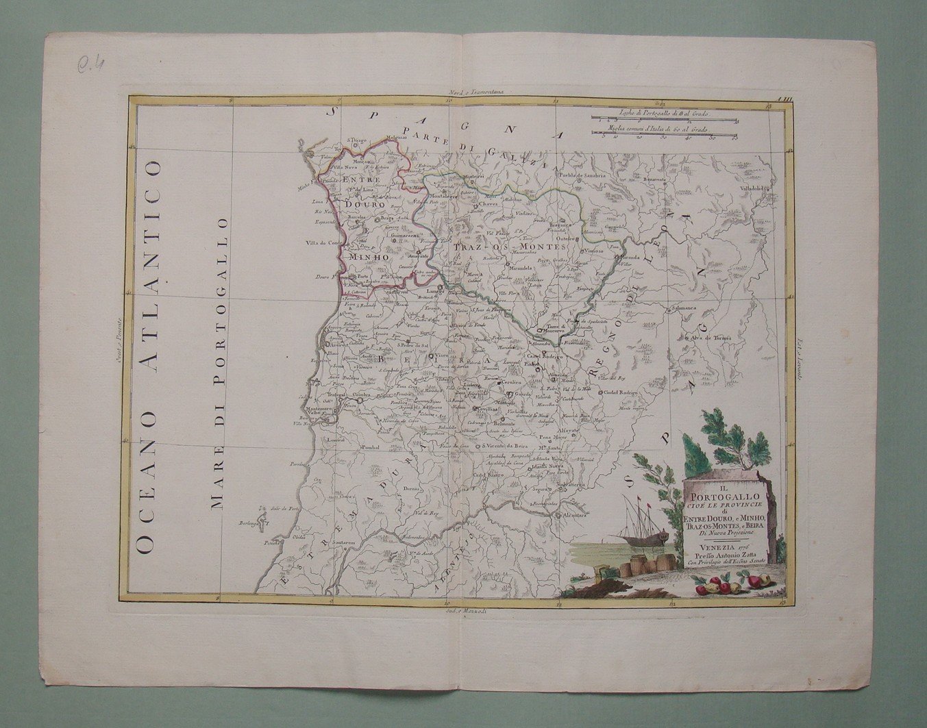 ZATTA Antonio. Il Portogallo cioè le Provincie di Entre Douro e Minho, Traz-os-Montes e Beira. Venezia, 1776. Double page engraved map by Zatta.Contemp. hand coloured in outline. Cartouche. Cm.30x41.