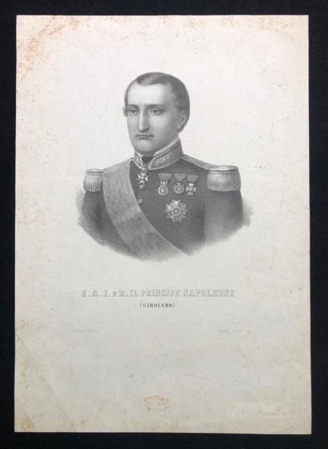 Firenze, 1859 (con timbro a secco dell'Editore). Litografia in b/n, cm 29 x 41,5 (il foglio) Ritratto a mezzo busto del principe Napoleone (Girolamo). Normale patina del tempo con marginali fioriture. .