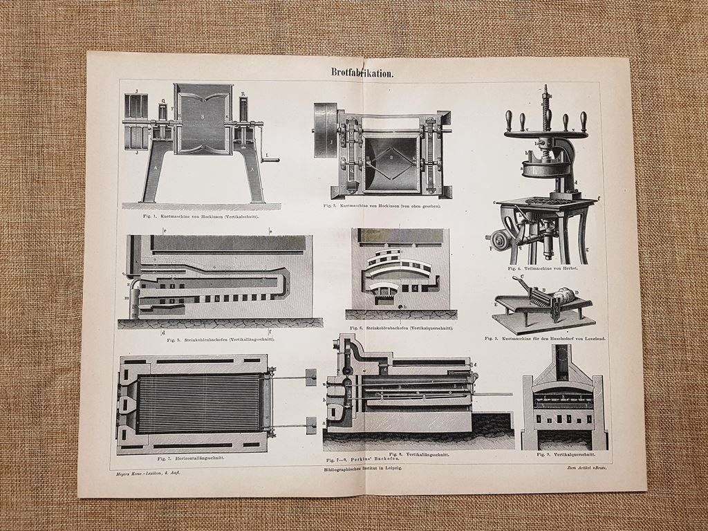 Il processo di produzione del pane Tavola del 1890 Rara tavola estratta da pubblicazione del 1890 Stampata su carta non retroscritta Il processo di produzione del pane Dimensioni: Cm 30,00 x 23,00 Codice prodotto: GEO-151