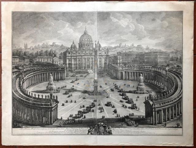 Incisione in rame stampata su due lastre e due fogli riuniti nella parte centrale, seconda tiratura del 1800 circa, b/n, cm 70,5 x 97 circa (alla lastra), 81,5 x 108 (l'intero foglio con i margini bianchi). Titolo e lunga dedicataria al margine inferiore all'Altezza Reale Eminentissima Errigo Benedetto Maria Vescovo di Frascati; più sotto, in minuta scrittura è presente una legenda a 13 voci: 1 Anfiteatro ornato con 320 Colonne di pietra tiburt.na, e 136 Statue della medes.ma pietra. 2 Fontane di acqua perenne. 3 Obelisco di granito rosso da Caio Cesare portato dall’Egitto a Roma, e messo nel suo circ.° alto piedi 81 e col Piedestall° 109. 4 Palazzo della Sag. Inquisizione. 5 Ch. di S. Salvatore in Campo S.to. 6 Seminar.° del Clero di San Pietro. 7 Palazzo per i Canonici della Basilica. 8 Sagrestia di S. Pietro. 9. Ch. di S. Marta. 10 Palaz.° Pontif.°. 11 Casino di Belvedere. 12 Torre dell’antiche mura della Città Leonina. 13 M.te Vaticano. Si tratta di una serie di tre incisioni, realizzate dal 1774 al 1778 e l'opera è dedicata a Enrico Benedetto Stuart, cardinale e duca di York ed erede cattolico al trono britannico. In questa prima tavola il Vasi realizza una splendida veduta a volo d'uccello che mostra la Piazza San Pietro con la Basilica Vaticana e con il Palazzo Vaticano. Al centro dell'immagine campeggia l'obelisco del Bernini e tutta la scena è resa con una grande accuratezza di dettagli, anche per quanto riguarda i colonnati semicircolari e tutti gli edifici circostanti, il cui tratteggio va via via attenuandosi per quelli sullo sfondo. Ad eccezione di questa, che è la prima tavola, le altre due documentano diversi momenti di cerimonie papali, l'una in esterno, con la veduta del fianco destro della Basilica Vaticana, e l'altra in interno; e sono rispettivamente dedicate all'Eminentissimo e Reverendissimo Principe, il Cardinale Leonardo Antonelli del Titolo di S. Sabbina, e alla Santità del Sommo Pontefice Papa Pio VI. Felicemente Regnante. Esemplare con imperfezioni e strappi marginali e con alcune minute abrasioni dell'inchiostro, bella impressione, buono tutto l'inciso. .
