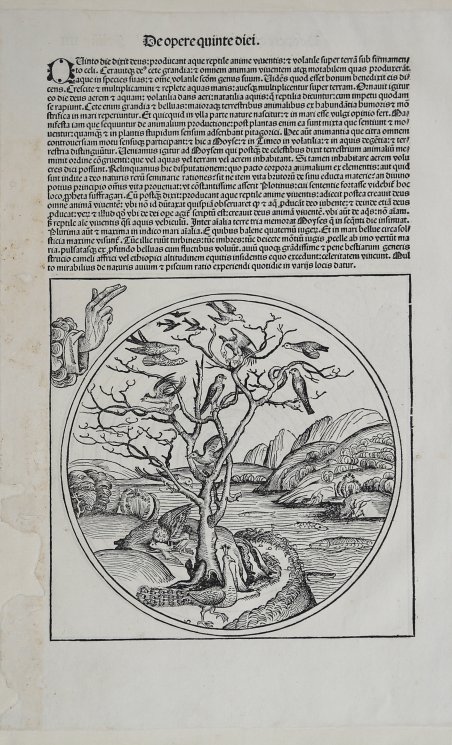 Silografia, mm 225x225 (foglio 295x465). Foglio IV. Testo latino.Raffigura il quinto giorno della Creazione del Mondo, con la formazione dei pesci e degli uccelli.Tratta dalla monumentale opera di Hartmann Schedel, il Liber Cronicarum (edizione tedesca), che rappresenta uno “dei più straordinari lavori mai realizzati” dall’editoria del XV secolo. Gli incisori erano Michael Wolgemuth, e il figliastro Wilhelm Pleydenwurff. Wolgemuth fu anche il tutore di Albrecht Dürer tra il 1486 e il 1490; recenti studi hanno dimostrato come Dürer stesso abbia collaborato alla realizzazione di quest’opera; alcune opere sono infatti attribuite al maestro di Norimberga. La stampa venne supervisionata dal grande stampatore Anton Koberger, le cui opere erano famose in tutta Europa. Woodcut, 1493.Showing the work of the Fifth Day, Creation of the Fish and Birds.Taken from the monumental work of Hartmann Schedel, Liber Cronicarum (Latin edition), which represents one of the "most extraordinary works ever made" from publishing the fifteenth century. The engravers were Michael Wolgemuth, and his stepson Wilhelm Pleydenwurff. Wolgemuth was also the tutor of Albrecht Dürer between 1486 and 1490. Recent studies have shown that Dürer himself has contributed to the realization of this work; some works are in fact attributed to the master of Nuremberg. The printing was supervised by the big printer Anton Koberger, whose works were famous throughout Europe. Cfr. Dodgson, Campbell, Catalogue of Early German and Flemish Woodcuts in the BM, 1903, 1911 D.28(28).