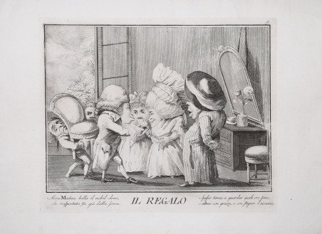 Acquaforte, 1791/95, priva di firma ed indicazioni editoriali. Da un soggetto di Giuseppe Piattoli. Bellissima prova, impressa su carta coeva, con margini, in ottimo stato di conservazione. Tavola della serie ' Lo Sposalizio di Marfisa, una serie di 10 opere incise da Carlo Lasinio su disegno di Giuseppe Piattoli e pubblicate a Firenze dalla tipografia di Niccolò Pagni e Giuseppe Bardi. Per la datazione delle stampe, sia Lazzaro che Scrase - analizzando gli esemplari conservati al Cantor Arts Center - propongono il 1790 basandosi, forse, sulla data della tavola intitolata “La buona notte”, l’unica in cui l’ultima cifra sembra essere uno zero. Tuttavia, l’assenza della serie di Marfisa nell’elenco delle opere in vendita in un altro ' Catalogo delle stampe incise in rame che si vendono in Firenze da Niccolò Pagni, e Giuseppe Bardi ' stampato a Firenze dopo il 1791, avvalora l’ipotesi di una datazione seguente a questa data poiché risulterebbe inconsueta la mancata promozione di una raccolta edita soltanto l’anno precedente. In un successivo catalogo della tipografia conservato nella Raccolta Bertarelli, troviamo citato “Lo sposalizio di Marfisa, o sia raccolta di Caricature diverse inventate da Giuseppe Piattoli in Num. 10 mezzi fogli imperiali, ed espresse a colori. Paoli 15”. Le dieci incisioni - mai rilegate e prive di frontespizio - accompagnate da iscrizioni di titolazione e documentarie, costituiscono un vero e proprio poemetto figurato con i momenti chiave che preludono a un matrimonio alla moda settecentesca, i cui eleganti versi stridono, volutamente, con i personaggi grotteschi ai quali si riferiscono, accentuandone il carattere ridicolo. La vasta letteratura satirica e burlesca di tradizione toscana, insieme alle poesie e canzoni popolari, ispirano certamente il Piattoli, al quale doveva essere nota la produzione del poeta Francesco Berni, vissuto due secoli prima, dal quale deriva il termine “bernesco” per definire un vero e proprio genere letterario, che ebbe numerosi imitatori e influenzerà anche la pittura caricaturale a cavallo tra Sei e Settecento. Altra fonte di ispirazione, fu il poema eroicomico, intitolato ' La Marfisa Bizzarra, composto da Carlo Gozzi tra il 1761 e il 1768, il quale offre al pubblico una stravagante versione del mondo epico-cavalleresco. Per quanto riguarda, invece, le fonti grafiche e pittoriche utilizzate dall’artista se ne possono suggerire molteplici e di diversa provenienza: quella anglosassone - soprattutto la famosa serie realizzata da William Hogarth, tra il 1743 e il 1745, dal titolo ' Mariage à la mode; quella veneta - motivi satirici e scherzosi del costume veneziano caratterizzano le incisioni di Giandomenico Tiepolo, che ritraggono scene di vita quotidiana; quella romana, dove l’abbondante produzione caricaturale di Pier Leone Ghezzi era all’epoca tra le più diffuse, e non ultima la tradizione toscana, i cui personaggi deformi saranno tra i soggetti preferiti della pittura di genere dal Cinquecento al Settecento. Sarà però l’incisore lorenese Jacques Callot, arrivato nel 1611 a Firenze, a creare con i suoi ‘Gobbi’ una tipologia caricaturale che influenzerà non solo le opere di artisti a lui coevi come Stefano Della Bella e Baccio del Bianco, ma anche quelle del bresciano Faustino Bocchi e di Giovanni Domenico Ferretti, rievocanti in alcuni tratti le affascinanti grottesche di Gaetano Piccini, i cui personaggi - i cosiddetti caramogi - sono gli stessi che popolano ' Lo Sposalizio di Marfisa. Piattoli attinge, dunque, a piene mani da questi repertori traendo ispirazione soprattutto dai disegni di Baccio, nonostante siano tra quelli meno conosciuti poiché non tradotti in incisione. Per il Piattoli le ‘Nozze di Marfisa’ non sono altro che il pretesto per deridere benevolmente l’ingenuo e coinvolgente sentimento amoroso della fanciulla desiderosa di percorrere tutte le fasi convenzionali che preludono al matrimonio, a cominc. Etching, 1791/95, unsigned and without printing details. From a subject by Giuseppe Piattoli. Beautiful proof, impressed on contemporary wove paper, with margins, in excellent condition. Plate from the series ' Lo Sposalizio di Marfisa, a series of 10 works engraved by Carlo Lasinio from a drawing by Giuseppe Piattoli and published in Florence by the printing house of Niccolò Pagni and Giuseppe Bardi. For the dating of the prints, both Lazarus and Scrase -analyzing the examples preserved at the Cantor Arts Center - propose 1790 based, perhaps, on the date of the panel titled "La buona notte," the only one in which the last figure appears to be a zero. However, the absence of the Marfisa series in the list of works for sale in another ' Catalogo delle stampe incise in copperplate che si vendono in Firenze da Niccolò Pagni, e Giuseppe Bardi ' printed in Florence after 1791, supports the hypothesis of a dating after this date since it would be unusual for a collection published only the previous year not to be promoted. ' In a later catalog of the printer preserved in the Bertarelli Collection, we find the series listed as "Lo sposalizio di Marfisa, o sia raccolta di Caricature diverse inventate da Giuseppe Piattoli in Num. 10 mezzo fogli imperiali, ed espresse a colori. ' 15 Pauls." The ten engravings, lacking a frontispiece, constitute a veritable figurative poem with the key moments that prelude an eighteenth-century fashionable wedding, whose elegant verses deliberately clash with the grotesque characters to whom they refer, accentuating their ridiculous character. The vast satirical and burlesque literature of the Tuscan tradition, together with popular poems and songs, certainly inspired Piattoli, to whom the production of the poet Francesco Berni, who had lived two centuries earlier, must have been familiar, from whom the term "bernesco" was derived to define a true literary genre, which had numerous imitators and would also influence caricature painting at the tur