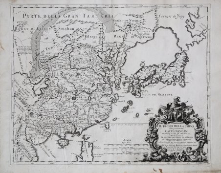 Carta di Cantelli da Vignola della Cina, del Giappone e della Corea, che presenta una visione suggestiva e aggiornata dell'Estremo Oriente grazie alle relazioni dei gesuiti e degli olandesi. L'inquadramento e i contorni derivano dalla carta di Martino Martini del 1652 prodotta da Blaeu, ma questa carta è significativamente aggiornata, almeno in parte, dalle relazioni dei gesuiti Bento de Góis e Johann Grueber. Carta geografica tratta dal ' Mercurio geografico overo Guida Geografica in tutte le parti del Mondo conforme le Tavole Geografiche del Sansone Baudran de Cantelli Data in luce con direttione, e cura di Gio. Giacomo de Rossi nella sua stamperia ' raccolta di carte edita a Roma tra il 1660 ed il 1730 dalla tipografia De Rossi - la datazione delle carte va dal 1669 al 1715 - la cui prima stesura si deve a Giovanni Giacomo de Rossi. Nel corso degli anni l’atlante fu arricchito da un numero sempre maggiore di carte nelle successive edizioni curate prima da Domenico de Rossi e poi dal figlio Filippo. Il ' Mercurio Geografico ' è una raccolta che raccoglie lavori di cartografi quali Michele Antonio Baudrand, Nicolas Sanson, Augustin Lubin, Filippo Titi, Giacomo Ameti, Giovanni Antonio Magini e Innocenzo Mattei e che ' contempla come "corpus" principale ' la grande produzione del geografo Giacomo Cantelli da Vignola. Le carte sono finemente copiate ed intagliate dai maggiori incisori dell'epoca tra i quali Falda, Widman, Barbey, Widman, Lhuillier, Donia, Mariotti. ' Cantelli era un geografo e cartografo, originario di Montorsello presso Vignola; compiti gli studi umanistici a Bologna, nel 1669, entrò ivi a servizio del marchese Obizzo da Ferrara come segretario, poi passò a Venezia e di là a Parigi, dove strinse rapporti coi maggiori geografi francesi del tempo, il Du Val, Nicola Sanson e specialmente Michel Antoine Baudrand, col quale rimase poi sempre in corrispondenza. Tornato a Bologna, fu per lunghi anni segretario di Rinieri Marescotti; ma, intorno al 1675 o poco dopo, si recò, forse più volte, a Roma, ed entrò in relazione con la celebre officina cartografica dei De Rossi, la quale pubblicò poi la massima parte delle sue carte geografiche. La sua fama di cartografo si era ormai consolidata, tanto che venne chiamato sia dal papa Innocenzo XI che dal duca di Modena e Reggio Francesco II d'Este, che lo desideravano entrambi come cartografo ufficiale. Scelse la corte di Francesco II, e in novembre 1685 fu nominato geografo di corte. Dal 1686 al 1689 eseguì numerose carte di paesi e territori europei. Costruì di sua mano un mappamondo e un globo celeste, che rimasero esposti per qualche tempo nell'atrio della Biblioteca Estense a Modena. Morì in Modena il 30 novembre 1695. Quasi tutte le carte furono inserite nel ' Mercurio Geografico, ' il notissimo atlante pubblicato a Roma dai De Rossi. Nella prima edizione del ' Mercurio Geografico ' furono pubblicate 19 sue carte, assieme ad altre del Sanson e del Baudrand. Nel 1692 uscì una seconda edizione in due volumi, che conteneva lavori da lui eseguiti (88 carte, intagliate al bulino dall'incisore Antonio Barbey). “Bento de Góis (1562-1607) was the first known European to travel from India to China via Afghanistan and the Pamirs; his mission was to establish whether the Cathay of Marco Polo's stories was the same country as China. The Jesuit Johannes Grueber (1623-1680) was a collaborator of Father Johann Adam Schall von Bell at the Beijing astronomical obser- vatory and in 1661 he made a land trip from Beijing to India by way of Tibet and Nepal. Jean-Baptiste Tavernier (1605-1689) was a French merchant and traveller, author of the 1670 book Six voyages through Europe into Asia. The map features some updates about China compared with Martini's model; for example, to the north of Korea, about the "Kingdom of Niuche", Cantelli wrote Questi sono li Tartari, che occuparono, et al presente regnano nella China (These are the Tartars who occupied, and now reign in, China). . Cantelli da Vignola map of China, Japan and Korea, presenting a striking and up-to-date view of the Far East benefitting from Jesuit and Dutch reports. Its framework and outline are derived from the 1652 Martino Martini map produced by Blaeu, but this map is significantly updated, at least in part, from the reports of the Jesuits Bento de Góis and Johann Grueber. Map taken from ' Mercurio geografico overo Guida Geografica in tutte le parti del Mondo conforme le Tavole Geografiche del Sansone Baudran de Cantelli Data in luce con direttione, e cura di Gio. ' Giacomo de Rossi nella sua stamperia ' collection of maps published in Rome between 1660 and 1730 by the typography De Rossi - the date of the maps goes from 1669 to 1715 - whose first edition is due to Giovanni Giacomo de Rossi. Over the years the atlas was enriched by an increasing number of maps in subsequent editions edited first by Domenico de Rossi and then by his son Filippo. The ' Mercurio Geografico ' is a collection that brings together works by cartographers such as Michele Antonio Baudrand, Nicolas Sanson, Augustin Lubin, Filippo Titi, Giacomo Ameti, Giovanni Antonio Magini and Innocenzo Mattei, and which includes as its main "corpus" the great production of the geographer Giacomo Cantelli da Vignola. The maps are finely copied and engraved by the major engravers of the time including Falda, Widman, Barbey, Widman, Lhuillier, Donia, Mariotti. ' Cantelli was a geographer and cartographer, a native of Montorsello near Vignola; duties his humanistic studies in Bologna, in 1669, he entered the service of Marquis Obizzo da Ferrara there as secretary, then went to Venice and from there to Paris, where he formed relations with the leading French geographers of the time, Du Val, Nicola Sanson and especially Michel Antoine Baudrand, with whom he then remained in constant correspondence. Returning to Bologna, he was for long years secretary to Rinieri Marescotti; but, around 1675 or shortly thereafter, h