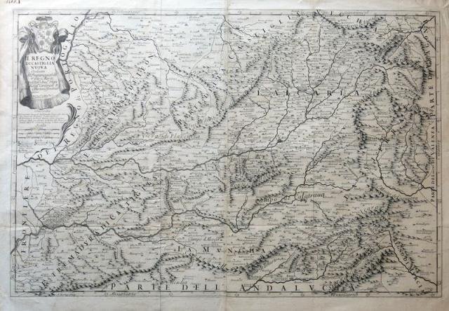 Incisione in rame all'acquaforte, b/n, cm 55,5 x 83,5 (alla lastra) più margini. Tratta dal "Mercurio Geografico, overo guida geografica in tutte le parti del mondo, conforme alle tavole geografiche del Sanson, Baudrand e Cantelli da Vignola", stampato da Giovanni, Giacomo e Domenico De Rossi e pubblicato a Roma nel 1692. Le carte, che recano nei cartigli le date dal 1650 al 1691, sono state realizzate da Giacomo Cantelli da Vignola, Michel Antoine Baudrand e Nicolas Sanson. La carta rappresenta il Regno di Castiglia, è descritta da Giacomo Cantelli da Vignola, incisa da Antonio Barbey e edita dalla celebre officina De Rossi. Stampata su due fogli poi uniti reca un grande cartiglio all'angolo superiore sinistro con dedica al Cardinale Celestino Sfrondati, margine graduato su tutto il perimetro. La carta si estende dalle frontiere del Regno di Portogallo al Regno di Valenza e di d'Aragona, dalla Castiglia Vecchia all'Andalusia. Giacomo Cantelli da Vignola (Vignola, 1643 - 1695), fu bibliotecario, geografo e primo cartografo ufficiale presso la corte di Modena del Duca Francesco II dal 1685. Le carte di quest'opera sono tutte di certa importanza e interesse, la maggior parte di esse sono disegnate dal Cantelli e molte portano cartigli con dediche a principi, regnanti o illustri personaggi. Alcune pieghe e punti fisiologici di leggero ingiallimento, bella impressione, buono stato di conservazione.
