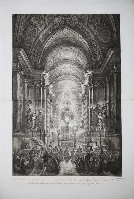 Cerimonia tenutasi nella Cappella Paolina, nel palazzo vaticano, con i chierici visti di spalle inginocchiati in primo piano, e oltre la cappella, illuminata da candele. Acquaforte e bulino, 1787, da un disegno di Louis-Jean Desprez. In basso a sinistra sotto l'immagine: Depres del.; in basso a sinistra: Cav Franco Piranesi inc. 1787; in basso al centro: Il Santo Padre in atto d'adorazione innanzi al Sacramento esposto solennemente da Lui nella Cappella Paolina in Vaticano la Domenica dell'Avvento. Si la grandiosa illuminazione che tutto il rimanente della machina, sono invenzione è disegno del Bernino. Questa è una delle serie di stampe di scenari drammaticamente illuminati incise e pubblicate da Francesco Piranesi su disegni dello scenografo Louis-Jean Desprez (1743-1804). Le altre includono "Il Santo Padre in adorazione nella Cappella Paolina in Vaticano" (1787), "Prospetto interiore del Tempio Vaticano ." (1787), "Fuoco artificiale detto la Girandola” (1788 circa), e una veduta dell'eruzione del Vesuvio del 1779. Si tratta di uno stato successivo della lastra, terminato ad acquaforte e bulino. Il primo stato era un delineato, inciso da Piranesi come base per l'acquerello di Desprez. Dopo la partenza di Desprez dall'Italia, Piranesi rielaborò la lastra in modo che potesse essere stampata senza bisogno di essere colorata. Ottima prova, impressa su carta vergata dell’inizio del XIX secolo, con grandi margini, in ottimo stato di conservazione. Bibliografia Wollin 1933 / Gravure originales de Desprez ou executées d'après ses dessins (p.112-113(2); Piranèse et les francais, 1740-1790, exhibition catalogue, ed. B. K. de Rola; Rome, Académie de France, 1976, pp. 121, 124-5; Magnus Olausson, “Desprez et Piranèse fils: de l’original à la reproduction,” La Chimère de Monsieur Desprez, ed. Régis Michel, Paris, 1994, pp. 47-50; Le Blanc C., Manuel de l'amateur d'estampes, 2, V. 2 p. 207, 1854-59; ' Petrucci C.A., Catalogo Generale delle Stampe tratte dai rami incisi posseduti dalla Calcografia Nazionale, 1015, p. 300, tav. 4, 1953. Ceremony held in the Cappella Paolina, in the Vatican palace, after Desprez, with clerics seen from behind kneeling in the foreground, and beyond the chapell, illuminated by candles. Etching, 1787, lettered with title and production detail: 'Despres del. - Cav Franco Piranesi inc. 1787; bottom center Il Santo Padre in atto d'adorazione innanzi al Sacramento esposto solennemente da Lui nella Cappella Paolina in Vaticano la Domenica dell'Avvento. Si la grandiosa illuminazione che tutto il rimanente della machina, sono invenzione è disegno del Bernino. This is one of series of separately issued engravings of dramatically lit scenarios engraved and published by Francesco after drawings by the stage-designer Louis-Jean Desprez (1743-1804) - others include 'Il Santo Padre in adorazione nella Cappella Paolina in Vaticano' (1787), 'Prospetto interiore del Tempio Vaticano .' (1787), qq.v., 'Fuoco artificiale detto la Girandola .' [1788?], and a view of the eruption of Vesuvius in 1779. This is a later state of the plate. The first state was in outline, etched by Piranesi as a base for Desprez to watercolour. After Desprez's departure from Italy, Piranesi reworked the plate so that it could be printed without needing to be coloured. A good impression on early 19th Century laid paper, full margins, very good conditions. Bibliografia Wollin 1933 / Gravure originales de Desprez ou executées d'après ses dessins (p.112-113(2); Piranèse et les francais, 1740-1790, exhibition catalogue, ed. B. K. de Rola; Rome, Académie de France, 1976, pp. 121, 124-5; Magnus Olausson, “Desprez et Piranèse fils: de l’original à la reproduction,” La Chimère de Monsieur Desprez, ed. Régis Michel, Paris, 1994, pp. 47-50; Le Blanc C., Manuel de l'amateur d'estampes, 2, V. 2 p. 207, 1854-59; ' Petrucci C.A., Catalogo Generale delle Stampe tratte dai rami incisi posseduti dalla Calcografia Nazionale, 1015, p. 300, tav. 4, 1953. Cfr.