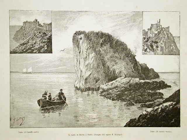 Tre vignette in unico foglio raffiguranti il nuovo, il vecchio Castello e lo scoglio dove si recava Dante durante il suo esilio. Testo al verso non inerente