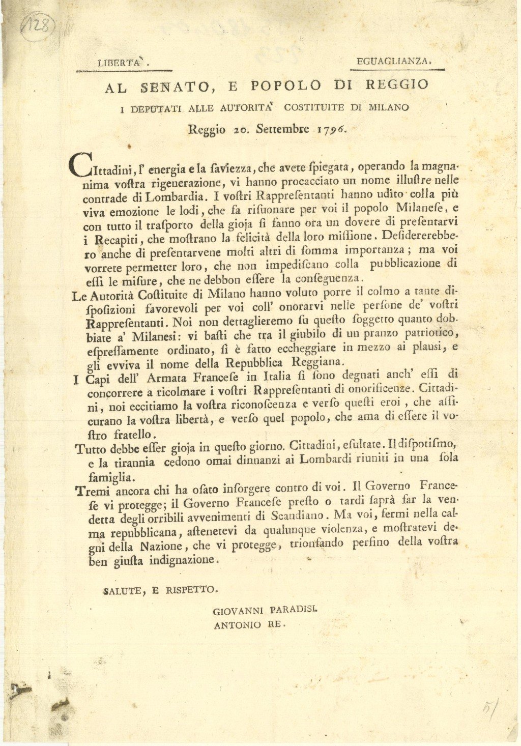 Documento, antico ed originale proveniente da importante collezione reggiana, che riporta "Cittadini, l'energia e la faviezza, che avete spiegata, operando la magnanima vostra rigenerazione, vi hanno procacciato un nome illustre nelle contrade di Lombardia".