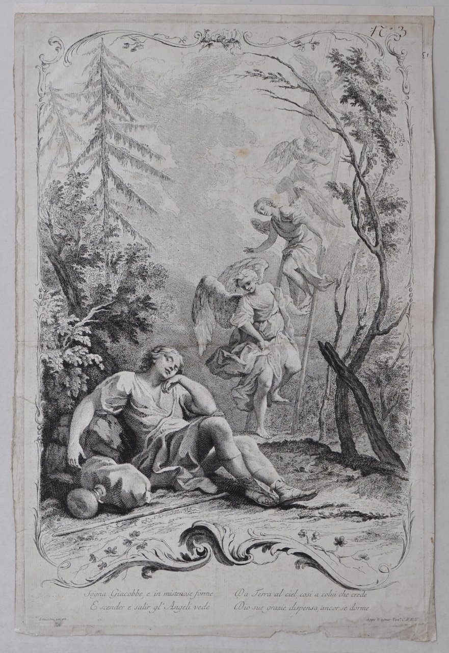 Incisione all'acquaforte di mm 341 x 515 alla battuta, su carta di filo veneziana; filigrana tre lune. Iscrizioni: sotto la figura incorniciata "Sogna Giacobbe, e in misteriose forme - E scender e salir gl'Angeli vede - Da Terra al ciel; così a colui che crede - Dio sue grazie dispensa, anche se dorme"; nell'angolo inferiore sinistro : "Amiconi inven." e in quello destro :"Appo Wagner Ven.a C.P.E.S." Nell'angolo superiore destro una annotazione a penna in bella grafia settecentesca :" N° 3". Foglio in ottima condizione, se si esclude una gora marginale all'angolo inferiore destro. La stampa rappresenta una felicissima espressione di quella che fu forse la più importante fucina di artisti veneziani. Il rapporto tra l'Amigoni ed il Wagner era già profondamente consolidato quando, nel 1739, entrambi sbarcarono a Venezia; il grande incisore e calcografo tedesco aprì subito una bottega di incisione a San Zulian e ottenne il privilegio dal Senato della Repubblica per le sue stampe dal 1749. Alle opere stampate da Wagner senza una precisa indicazione dell'incisore possono aver lavorato, da soli o in partecipazione, i più grandi artisti veneziani del bulino, quasi tutti passati, per un tempo più o meno lungo, nella bottega a San Zulian; tra i più celebri si possono citare Flipart, Zilotti, Dall'Acqua, Berardi, Volpato, Brustolon, Leonardis, Daniotto, Zucchi.