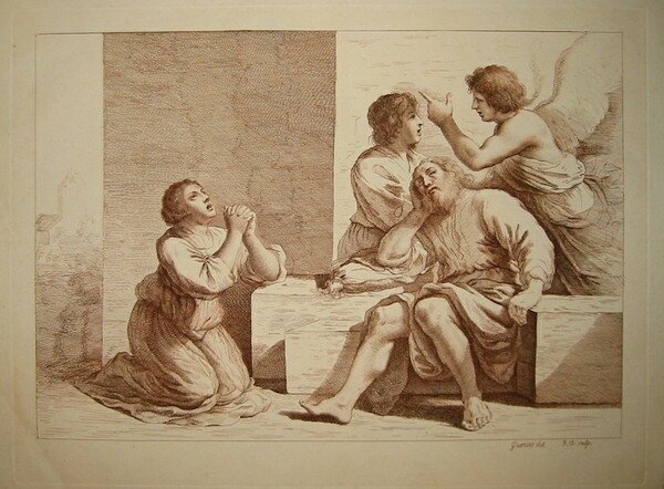 Incisione originale su rame all’acquaforte e bulino (cm. 44x33 più ampi margini bianchi) da un soggetto di Gio. Francesco Barbieri detto il Guercino. Carta vergellata. Ottimo esemplare.