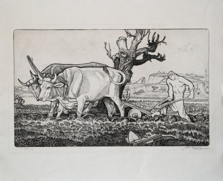Acquaforte, 1930 circa, firmata in lastra in basso a destra. Titolo scritto a matita in basso a sinistra, firmata a matita in basso a destra Gustavo Rodella. Tiratura di 30 esemplari, prova 14/30. Magnifica prova, impressa su carta coeva del tipo giapponese, con margini, in perfetto stato di conservazione. Gustavo Rodella (Roma, 15 agosto 1891 – 1937) è stato un incisore e acquerellista italiano. Figlio di Ottavio, pittore specializzato in soggetti militari, e di Angela Canonica. Dopo il fallimento della società editrice, per cui lavorava il padre, tutta la famiglia si spostò a Milano, dove Gustavo si iscrisse e si diplomò all'Accademia di Brera. Gustavo Rodella si trasferì a Roma nel 1912 e aprì uno studio in via Margutta. Nel 1913 esordì a una mostra dell'Associazione Amatori e Cultori di belle arti e nel 1929 ottenne la cattedra di Tecniche dell'incisione all'Accademia di Belle Arti di Roma. Utilizzava varie tipologie incisorie: la xilografia, l'acquaforte, l'acquatinta, la vernice molle, la puntasecca e la litografia. Fu uno dei 25 fondatori del Gruppo Romano Incisori Artisti (Gria), costituito a palazzo Venezia, a Roma, per iniziativa di Federico Hermanin. Realizzò all'acquarello figurini e ammiccanti signorine; incise vedute romane ad acquaforte o ad acquatinta, come la Chiesa di San Carlo alle Quattro Fontane. Ha disegnato copertine per il "Giornalino della Domenica". Un'altra sua incisione, popolaresca, rappresenta i preparativi per una esecuzione del boia romano Mastro Titta, a Piazza del Popolo. Incisione di taglio verista è Le Gerle, del 1909; un'acquatinta di gusto simbolista è L'Albero di villa d'Este, del 1932. Prese parte a circa settanta esposizioni, tra cui la mostra Coloniale di Roma, le mostre del Bianco e Nero di Milano e di Firenze, l'Esposizione d'Arte Figurativa di Torino e mostre a New York, a Buenos Aires e a Los Angeles nel 1923, a Chicago nel 1931, a Bordeaux nel 1932, a Varsavia e a Vienna nel 1933, a Monaco di Baviera nel 1934. Etching, circa 1930, signed in plate at lower right. Title written in pencil at lower left, signed in pencil at lower right Gustavo Rodella. Limited edition of 30 copies, proof 14/30. Magnificent proof, printed on contemporary Japanese paper, with margins, in perfect condition. Cfr.