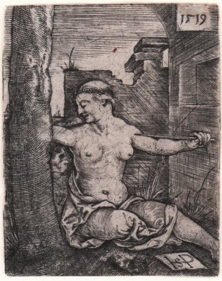 Lucrezia nuda a figura intera, seduta in vista frontale con la testa di profilo a sinistra. Si appoggia con la mano destra a un tronco d'albero e con la sinistra tiene il pugnale al petto; sullo sfondo a destra edifici in rovina. Bulino, 1519, firmato con monogramma in basso a destra e datato su una tavoletta in alto a destra. Esemplare nel secondo stato descritto da Hollstein. Lucrezia, la giovane matrona romana suicidatosi dopo aver subito lo stupro da parte di Sesto Tarquinio, figlio dell’ultimo re di Roma. Lo stupro e il suicidio di Lucrezia sono stati oggetto, nei secoli, d'interesse per molti pittori, e non solo scrittori e musicisti. Ognuno di loro l'ha raccontata in modo diverso, secondo le fonti cui si rifaceva e gli aspetti valoriali che voleva mettere in risalto. Per alcuni è stata l'eroina di cui esaltare le doti esemplari da imitare, per altri un mito da demolire o la donna vittima, non solo di uno di stupro ma anche di una visione culturale patriarcale. La sua storia non è una leggenda qualsiasi, ma piuttosto un "mito", perché rappresenta un racconto nel quale un'intera cultura ha riconosciuto per secoli alcuni contenuti fondanti della propria identità. Questa dimensione mitica spiega perché la vicenda di Lucrezia abbia attraversato i secoli e ispirato, non solo scrittori, musicisti e pittori, ma sia stata scelta anche per raffigurare i cassoni delle spose benestanti. La vicenda di Lucrezia risale al 509 a. c. ma la sua menzione più antica in letteratura è nel De Repubblica di Cicerone, che utilizza la sua storia per esaltare i valori della Repubblica Romana, ponendo al centro l'offesa subita da una famiglia e da un popolo per lo stupro di una sua matrona. Si rifece a queste prime narrazioni su Lucrezia lo storico Tito Livio che la inserì nel patrimonio dei grandi exempla cui ispirarsi. Nei suoi ' Annali o Ab Urbe condita, scritti fra il 30 a. c. e la sua morte, racconta in modo drammatico, quasi teatrale, tutti i dettagli della vicenda. La sua versione ha influenzato molti autori dell'età repubblicana fino al Tardoantico e dei secoli successivi. Poco prima del 1520, alcuni giovani artisti della cerchia di Albercht Dürer presero a realizzare incisioni molto piccole che hanno sfidato lo spettatore con un mondo in miniatura, un mondo di nuovo soggetto laico e di interpretazioni non convenzionali di temi tradizionali. A causa delle ridotte dimensioni delle loro incisioni, questi artisti sono stati appellati a lungo, con il nome collettivo, e poco lusinghiero, di Piccoli Maestri di Norimberga. Il nucleo del gruppo consiste in tre artisti di Norimberga, Hans Sebald & Bartel Beham e Georg Pencz, e inoltre Jacob Bink da Colonia e Heinrich Aldegrever da Soest. Buona prova, impressa su carta vergata coeva, rifilata al rame, in buono stato di conservazione. Bibliografia Pauli 1901-11, Hans Sebald Beham: Ein Kritisches Verzeichniss seiner Kupferstiche Radirungen und Holzschnitte (82.II); Hollstein, German engravings, etchings and woodcuts c.1400-1700 (82.II); Bartsch, Le Peintre graveur (VIII.147.78). Lucretia full-length nude, seated in frontal view with head in profile to left. She leans on a tree trunk with her right hand and holds dagger to her chest with her left; in background at right ruined buildings. Engraving, 1519, signed with monogram at lower right and dated on tablet at upper right. Example in the second state described by Hollstein. Lucretia, the young Roman matron who committed suicide after being raped by Sextus Tarquinius, son of the last king of Rome. Lucretia's rape and suicide have been the subject, over the centuries, of interest to many painters, and not just writers and musicians. Each of them recounted her differently, according to the sources they drew on and the value aspects they wanted to emphasize. For some she was the heroine whose exemplary qualities to be exalted and imitated, for others a myth to be demolished or the woman victim, not only of one of rape but also of a patriarchal cultural vision. Her story is not just any legend, but rather a "myth" because it represents a tale in which an entire culture has for centuries recognized certain foundational contents of its identity. This mythical dimension explains why the story of Lucretia has spanned the centuries and inspired, not only writers, musicians and painters, but has also been chosen to depict the chests of wealthy brides. The story of Lucretia dates back to 509 B.C., but its earliest mention in literature is in Cicero's De Repubblica, which uses her story to extol the values of the Roman Republic, placing at its center the indignity suffered by a family and a people for the rape of one of its matrons. He drew on these early narratives about Lucretia by the historian Titus Livius, who included her in the heritage of great exempla for inspiration. In his Annali o Ab Urbe condita, written between 30 B.C. and his death, he recounts all the details of the affair in a dramatic, almost theatrical way. His version influenced many authors from the Republican age to Late Antiquity and later centuries. Shortly before 1520, some young artists in Albercht Dürer's circle took to making very small engravings that challenged the viewer with a miniature world of new secular subject matter and unconventional interpretations of traditional themes. Because of the small size of their engravings, these artists have long been affixed with the collective, and unflattering, name of Small Nuremberg Masters. The core of the group consists of three artists from Nuremberg, Hans Sebald & Bartel Beham and Georg Pencz, and in addition Jacob Bink from Cologne and Heinrich Aldegrever from Soest. Good impression, printed on contemporary laid paper, trimmed to the borderline, in good condition. Bibliografia Pauli 1901-11, Hans Sebald Beham: Ein Kritisches Verzeichniss seiner Kupferstiche Radirungen und Holzschnitte (82.II); Hollstein, German engravings, etchings and woodcuts c.1400-1700 (82.II); Bartsch, Le Peintre