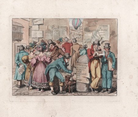 Scena popolare raffigurante borghesia al teatro, firmata e datata in lastra in basso a sinistra Pinelli 1832 Roma. ' Stampatore, pittore, scultore e disegnatore italiano. Apprese i rudimenti della scultura dal padre, artigiano di piccole statuette religiose di scarso valore. Questo apprendistato in tenera età incoraggiò Pinelli ad enfatizzare la plasticità e l’espressione rispetto ai valori del Neo-Classicismo, predominanti a Roma. Purtroppo, sono pervenute fino a noi solo pochi esemplari delle sue sculture in terracotta, mentre conosciamo il volume di acqueforti, Gruppi pittoreschi (Roma, 1834), con rappresentazioni di popolani. L’enfasi sul naturalismo e su soggetti di vita quotidiana è di nuovo evidente. Sebbene avesse studiato presso l’Accademia di Belle Arti a Bologna, sostenuto economicamente dal Conte Lambertini, il nipote di Papa Benedetto XIV, Pinelli non aveva interesse a seguire l'iter tradizionale del successo artistico attraverso i soggetti religiosi. Di ritorno a Roma, alla fine del XVIII secolo, decise di vendere le sue opere nei caffè frequentati dai turisti. ' Incisione in rame, finemente colorata a mano, in ottimo stato di conservazione. Molto rara. Popular costume signed at lower left Pinelli 1832 Roma. Italian printmaker, painter, sculptor and draughtsman. He learnt the rudiments of sculpture from his father, a maker of cheap religious statuettes. This early training encouraged Pinelli to emphasize plasticity and expression over the Neo-classical values prevalent in Rome. Although only a few of his terracotta figures survive however, he did produce a volume of etchings, Gruppi pittoreschi (Rome, 1834), depicting rustic groups. Its emphasis on naturalism and everyday subject-matter is also characteristic of his sculptures. Although he studied both at the Accademia di San Luca in Rome and at the Accademia di Belle Arti in Bologna, helped financially by Conte Lambertini, Pope Benedict XIV’s nephew, Pinelli was not interested in pursuing the traditional path to artistic success via religious or history painting. On returning to Rome in the late 1790s he chose to peddle his works at the cafés frequented by tourists. Copperplate, finely hand coloured, in excellent condition. Rare. Cfr.