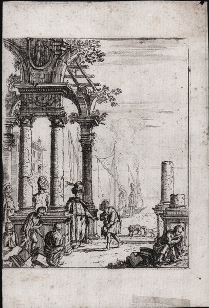 Acquaforte, 1659-1671 circa. Tavola VI della serie Paesaggi con rovine, architetture e figure. La serie è costituita da sette tavole, inclusa la prima di dedica al marchese Ottavio Gonzaga. Frans Geffels (Anversa, 1635 - Mantova, 1694) fu pittore, incisore e architetto. Formatosi nella città natia nella bottega dell'editore Mideller, giunse a Mantova verso il 1659, probabilmente chiamato dal conterraneo Daniel van den Dyck che, morto nel 1663, Geffels sostituì come prefetto delle fabbriche ducali gonzaghesche, voluto in questo ruolo da Carlo II di Gonzaga-Nevers. Servì poi anche l'ultimo duca Ferdinando Carlo. Bella prova, impressa su carta vergata coeva, con margini su tre lati, rifilata al rame a sinistra, qualche piccola ossidazione, per il resto in buono stato di conservazione. Bibliografia Hollstein, Dutch and Flemish etchings, engravings and woodcuts c.1450-1700 (1-7). Etching, 1659-71 circa. From the series: Landscape with Ruins, Architecture and Figures, consisting of seven plates, included the titlepage dedication to Marchese Ottavio Gonzaga. Plate VI of the series, showing an harbour with classical ruins, a beggar and a man in Oriental dress at centre, other beggars in foreground. Frans Geffels (Antwerp, 1635 - Mantua, 1694) was a painter, engraver and architect. Trained in his native city in the workshop of the publisher Mideller, he arrived in Mantua around 1659, probably called by his fellow countryman Daniel van den Dyck, who died in 1663, Geffels replaced as prefect of the Gonzaga ducal factories, wanted in this role by Charles II of Gonzaga-Nevers. He then also served the last duke Ferdinand Charles. A fine impression on contemporary laid paper, with margins on three side, trimmed to the platemark at the left, some foxing, otherwise good condition. Bibliografia Hollstein, Dutch and Flemish etchings, engravings and woodcuts c.1450-1700 (1-7). Cfr.